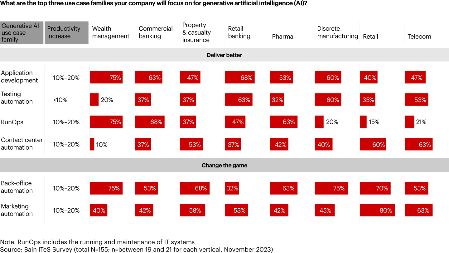 Back-office automation, application development, RunOps, marketing automation, and contact centers rank highly in demand across industries