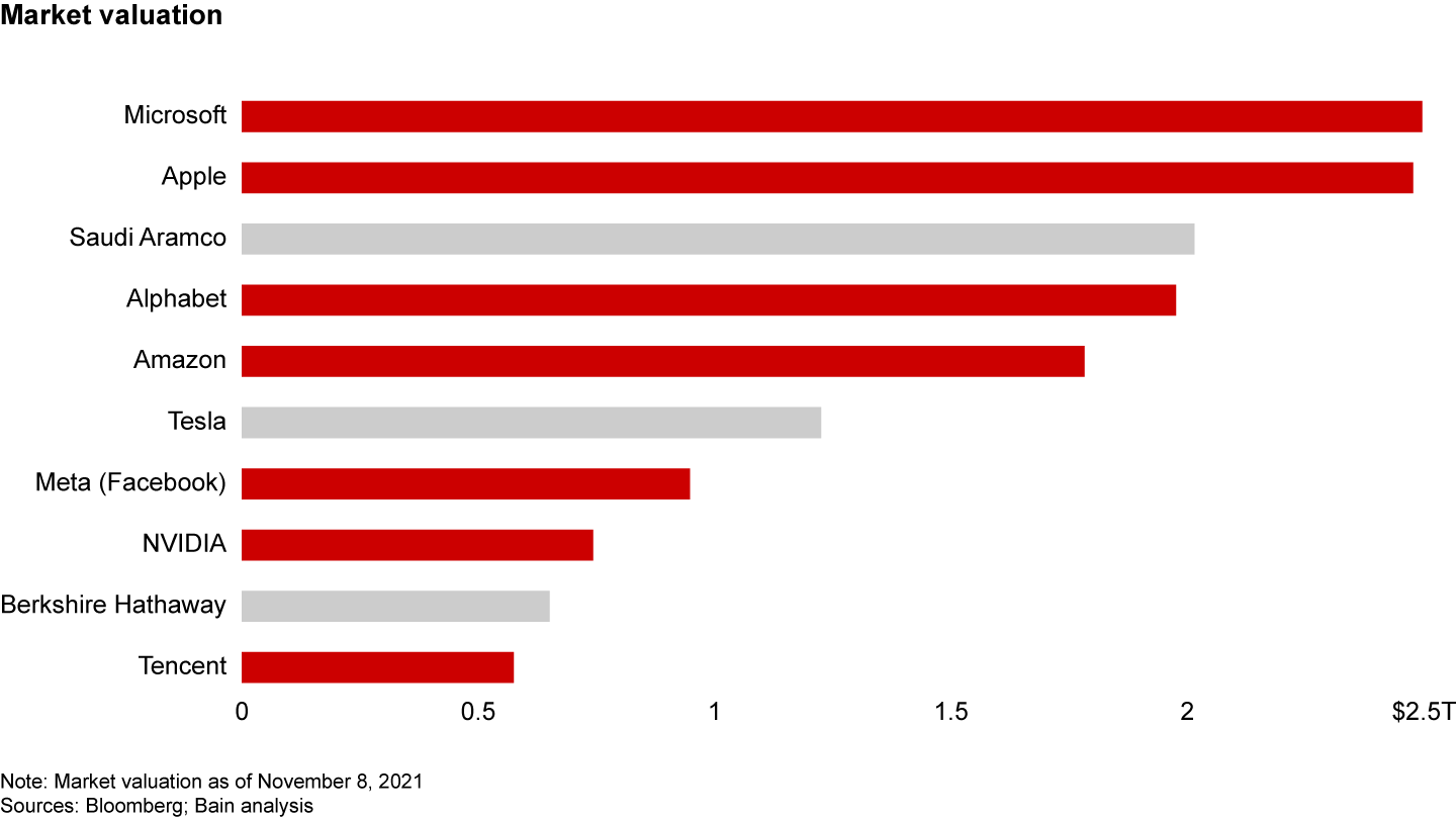 And it's not just tech companies that are winning with platforms. John Deere, the nearly two-century-old tractor manufacturer, launched a digital agribusiness platform, MyJohnDeere, in 2012. This product integrates data from equipment sensors with third-party data on crop characteristics, soil conditions, weather, and more to help farmers better manage their fleets and fields and increase productivity. John Deere developed the platform’s initial applications and data in-house to establish a minimum standard of quality and give users more incentive to join. The company later opened up the platform to be a hub for third-party applications. These innovations have deepened John Deere's relationships with customers and strengthened its core equipment business, ultimately helping the company to nearly triple its market capitalization since 2011.