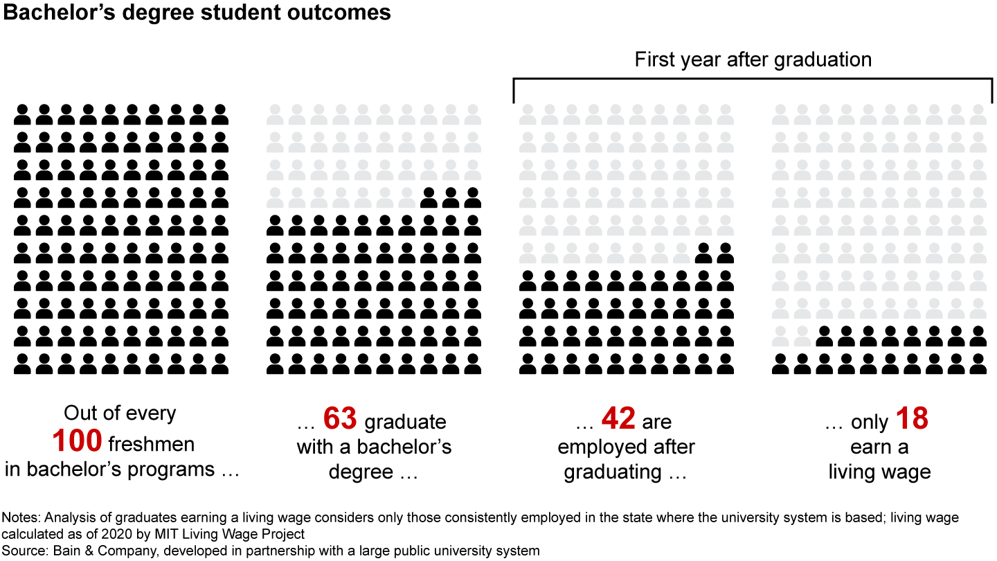 We’ve worked with K–12 systems in Washington, DC; Texas; Colorado; and New York that are trying to understand what happens to their alumni after graduation and how schools can improve those outcomes. We’ve worked with university systems representing nearly half a million students to help them tackle the same question. We’ve also engaged deeply with OneTen, a coalition of more than 50 large, multinational employers committed to cultivating economic opportunities for a more diverse set of future employees, focusing on Black talent. Finally, we’ve worked with system-building intermediaries, who are working to create and build career-connected learning systems at both the state and city level.