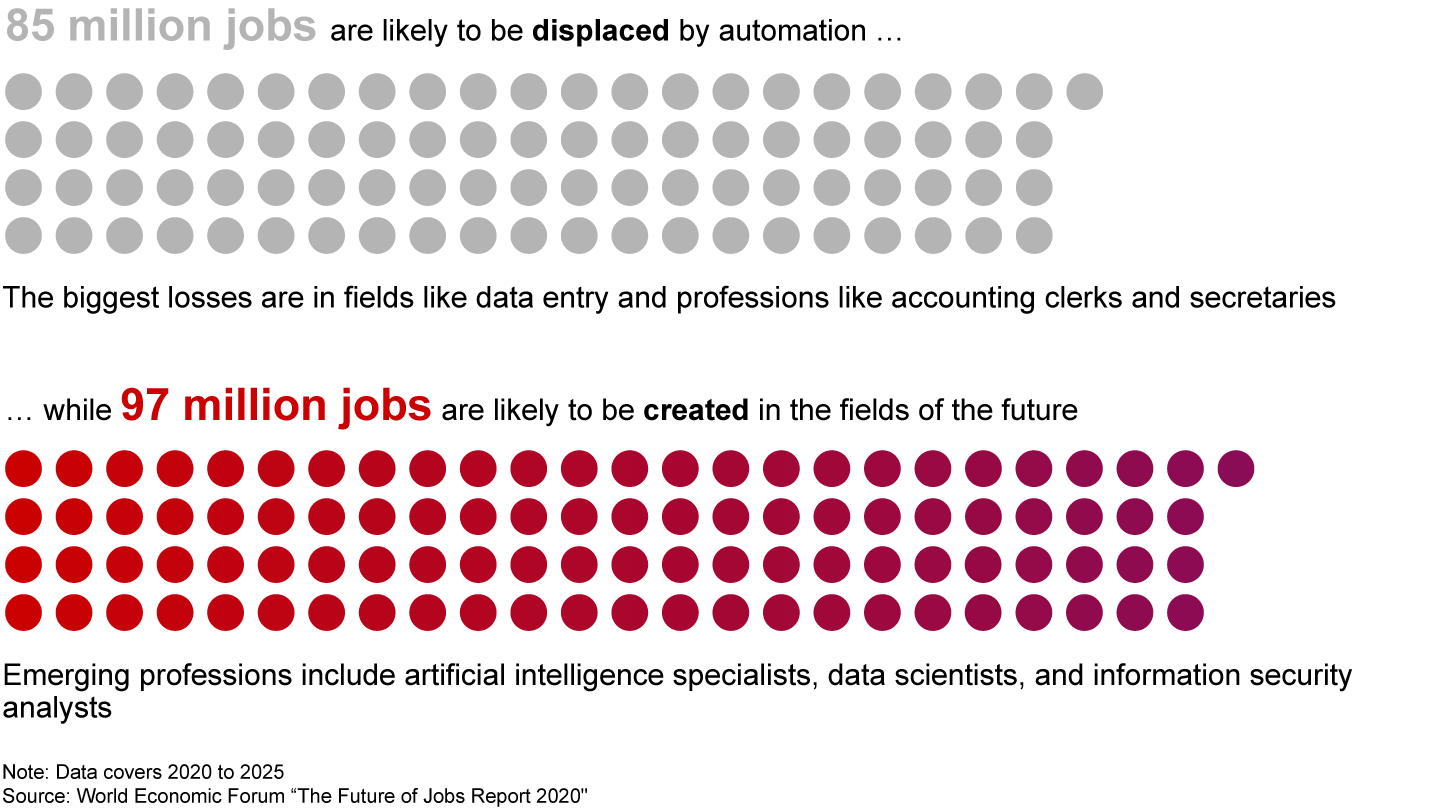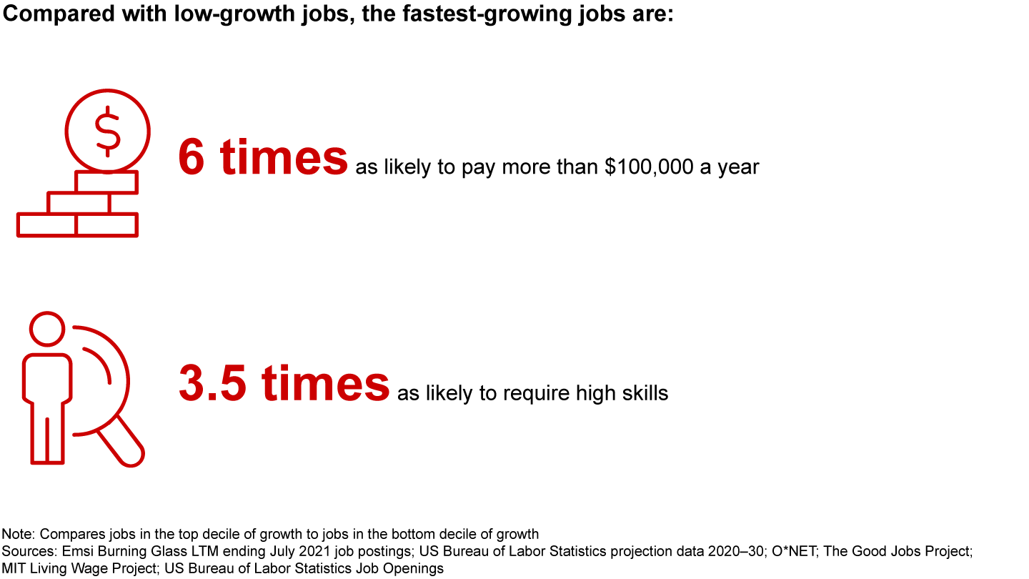 While the World Economic Forum predicts that 85 million jobs in roles like data entry, accounting clerks, and secretaries are likely to be displaced from 2020 to 2025, 97 million new jobs are likely to be created, such as artificial intelligence specialists, data scientists, and information security analysts (see Figure 1). Bain’s analysis of 50 million real-time US job postings (sourced from Emsi Burning Glass, 2021) found that the fastest-growing job categories are six times more likely to pay over $100,000, compared with the slowest-growing ones. They’re also about half as likely to be displaced by automation.