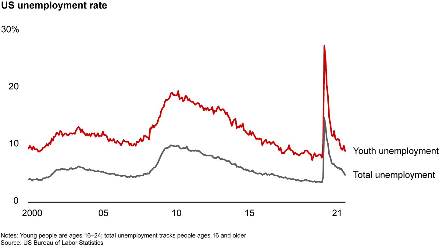 Youth underemployment, which measures the number of young people who have more education than their job requires, has also remained high in the US, with 40% of recent college graduates qualifying as underemployed.