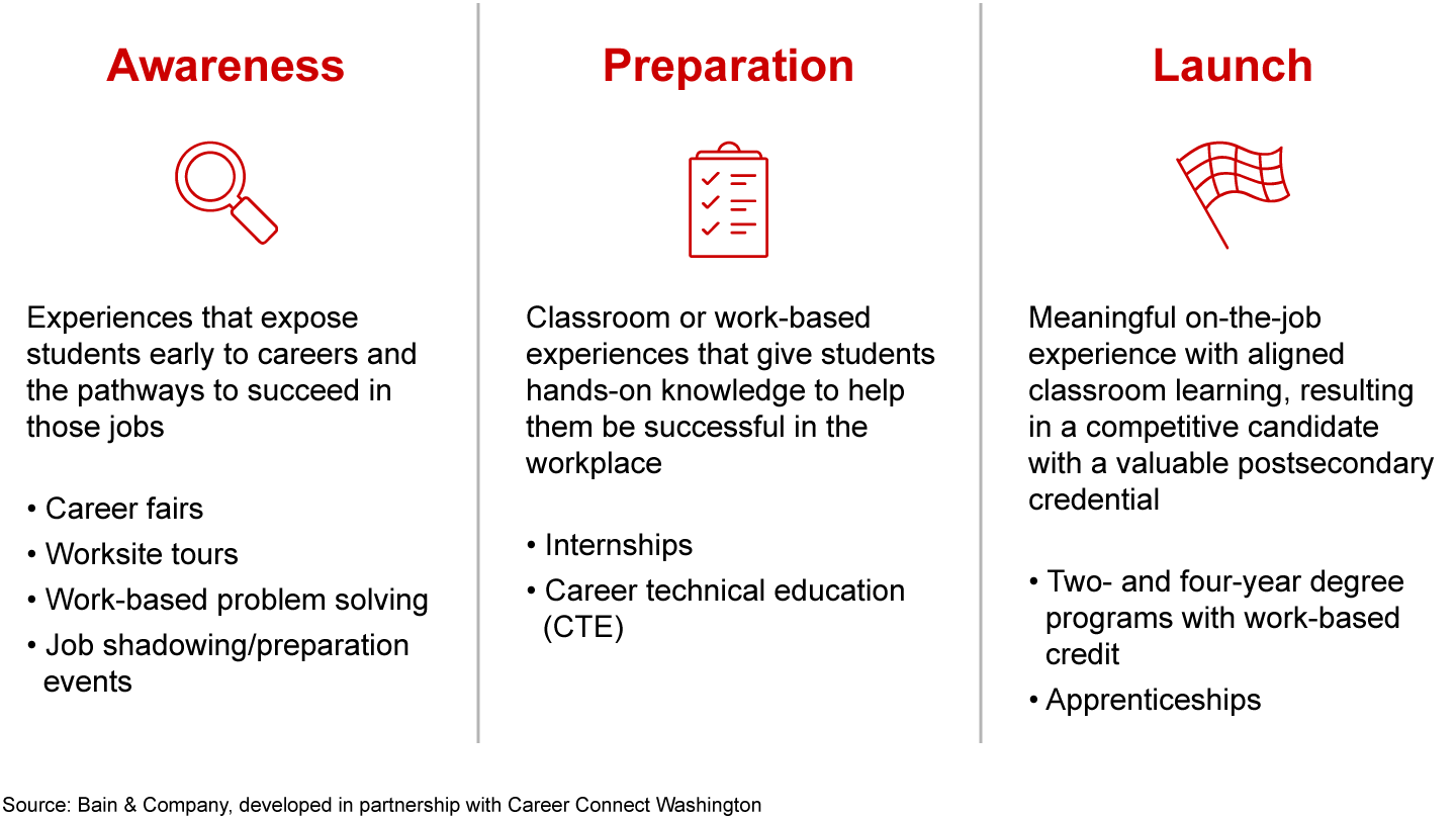 Career-connected learning is a three-phase journey: awareness, which includes experiences that expose students to the range of career options out there; preparation, which entails classroom or work-based experiences that prepare students to be successful in the workplace; and launch, which combines deeper work experience and aligned classroom learning that leads to an industry-valued credential and access to good jobs (see Figure 8).
