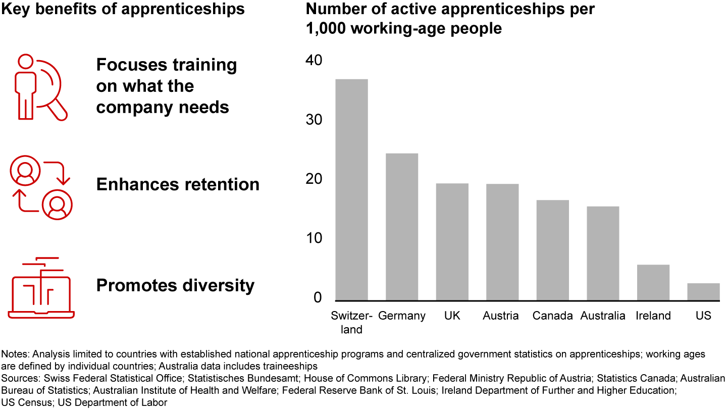 Both the scarcity and narrow focus of apprenticeships are curious given the measurable benefits these programs offer. Not only do they present an opportunity to focus training on the skills and workforce a company needs, but done right, they enhance retention, promote diversity, and often come with tax breaks. There’s no doubt that developing a strong program is an investment in time, money, and resources. But companies looking for scarce talent are increasingly finding ways to make the investment pay off.