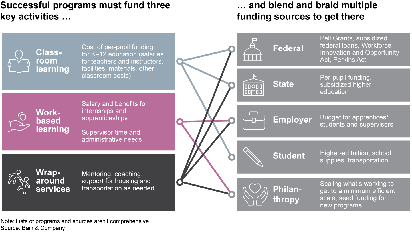 Choosing the programs starts with assessing the impact on students and businesses. But the ability to scale that impact is also essential. As Robert Schwartz, senior adviser to the Harvard Project on Workforce and cofounder of the Pathways to Prosperity Network, says, “Ultimately, unless you’re willing to aim for scale, you’re going to be stuck at the program level and not make meaningful impact at the system level.”