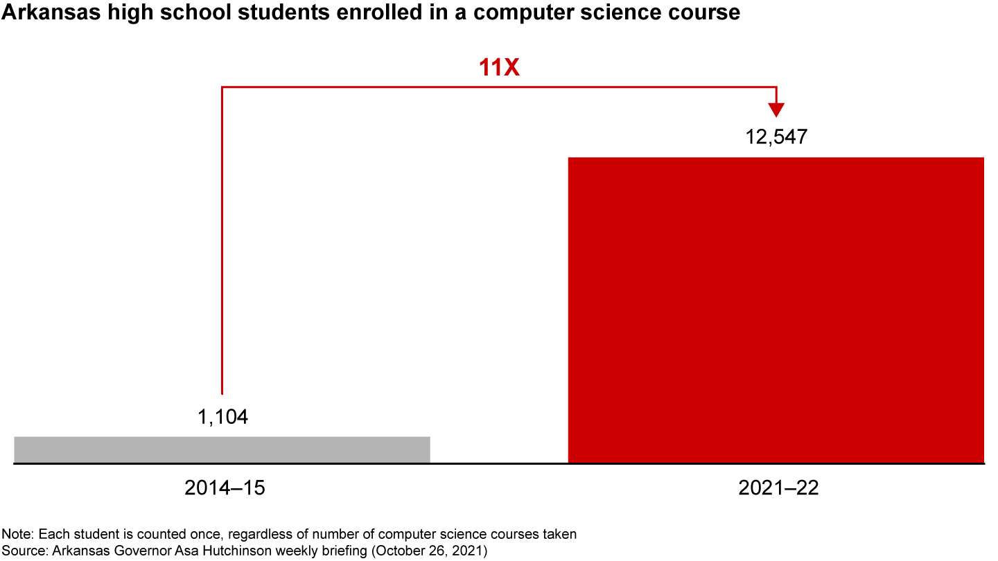 Governments and intermediaries can play a vital role in shining a bright light on the best opportunities. In 2014, Arkansas gubernatorial candidate Asa Hutchinson announced a plan for Arkansas to become a national leader in computer science. Arkansas had over 1,000 unfilled jobs in computer science. These are good jobs, with an average salary of over $70,000 (compared with the state average of just under $45,000). Yet given the small number of high school students in Arkansas then studying computer science, Hutchinson knew a talent gap was looming. Once elected, he embarked on a mission to make computer science training available to every student in Arkansas, which passed legislation in 2015 requiring that all high schools offer at least one high-level course in the field. The results were dramatic. Before the law passed, only around 1,000 Arkansas high school students were studying computer science. By 2021, the number of computer science students had climbed to over 12,500, including a big boost in female students (from 223 to nearly 4,000), and with Black students now proportional to the overall student population at roughly 20%. Every public high school in Arkansas now offers a course in computer science (compared with around 50% nationally)​, providing a robust set of opportunities for students and a new engine of growth for the state (see Figure 18).