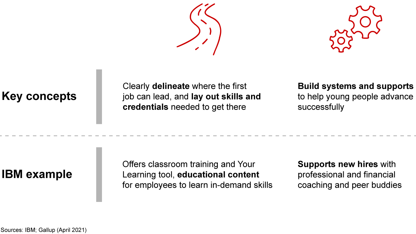 That starts with clearly delineating where that first job can lead and laying out the skills or credentials needed to get there. Then companies have to put systems and supports in place to ensure that young people in those jobs can successfully progress to the next one.