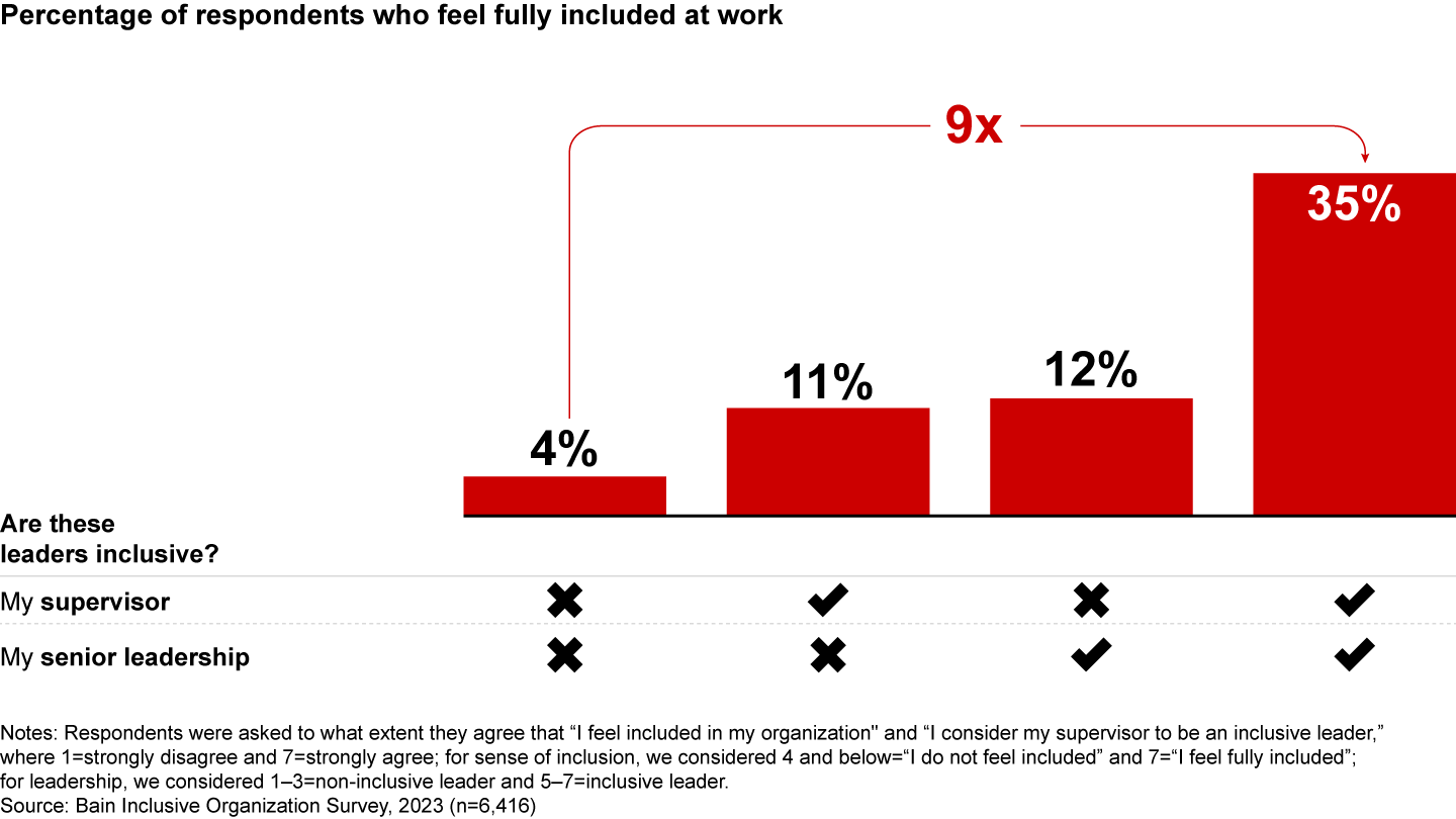 Investing differentially in leadership means identifying both the authentic actions that best promote inclusion and belonging as well as the leaders who, because they engage in these actions, can best teach by example. When it comes to inclusion, leaders have an outsized impact on the behaviors and even the sentiments of others; indeed, employees are nine times more likely to feel fully included when they perceive both their supervisors and senior management as inclusive (see Figure 3).