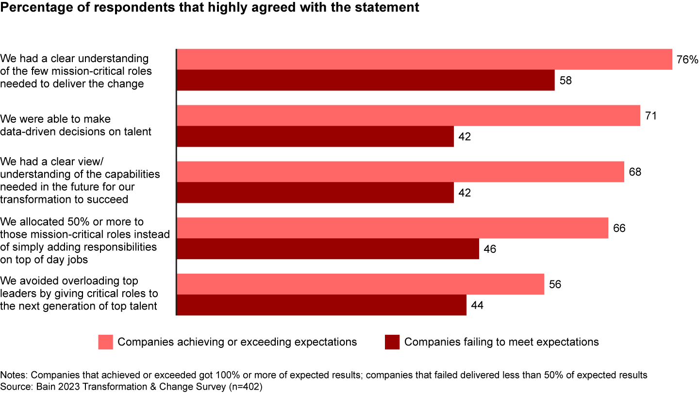 A menudo, las empresas no vinculan sus prioridades estratégicas a los resultados específicos necesarios en los próximos dos o tres años, lo que dificulta la identificación de las funciones esenciales para alcanzar dichos resultados y de las personas más idóneas para ocuparlas. Como resultado, con demasiada frecuencia las personas equivocadas acaban ocupando puestos críticos. Mientras que el 76% de los encuestados de empresas con un historial de transformación exitoso afirmaron que comprendían qué funciones críticas eran esenciales, solo el 58% de los encuestados de empresas con resultados mediocres consideraban que tenían la misma comprensión.