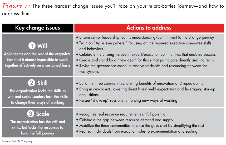 As soon as you begin executing micro-battles successfully, you’ll encounter a common reality: Things get tough. You’re creating micro-battle teams that are working through Agile principles, with cross-functional teams deploying prototypes and adapting these quickly, based on customer feedback. But you’re also still running the core business, with highly functional expert teams executing against the firm’s core processes. Both are vital, but you’ll find there are fundamental tensions between them that can erode enthusiasm. So it’s essential to address the company’s organizational will to sustain its focus on micro-battles. A number of things may be working against it, sometimes all at once.