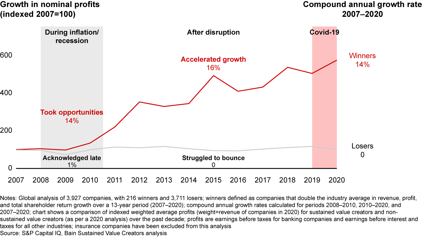 Many admit to a trade-off between delivering short-term financial value and making long-term sustainability investments, further intensified by short-term headwinds. However, as companies reimagine their supply chains for greater resiliency to disruption caused by the above and also the pandemic, winners will consider physical climate risks, too. According to our long-term research, making bold moves in times of disruption yields significant benefits. There is more growth post-disruption for companies that take risks during a downturn (see Figure 6). As Sergio Sandoval, group head of sustainability at Etex, told us: “In these challenging times, companies that will double down on sustainable products and portfolios will emerge stronger.”