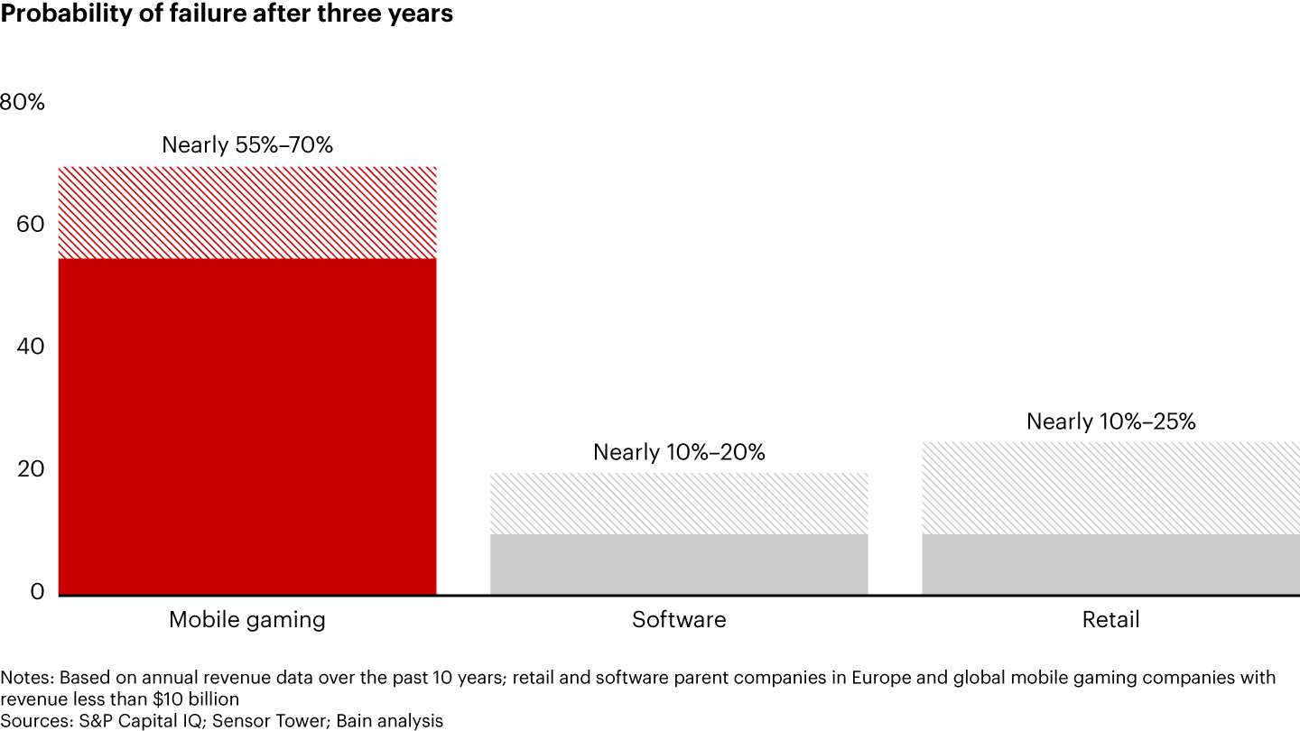 Mobile gaming is a high-risk business, and the chance of failure is greater than in many other industries. The likelihood of declining revenue is also high: More than 40% of all gaming companies with more than $10 million in revenue may see a decline in that revenue over a three-year period, compared with only 10% to 20% for other types of software businesses (see Figure 2).