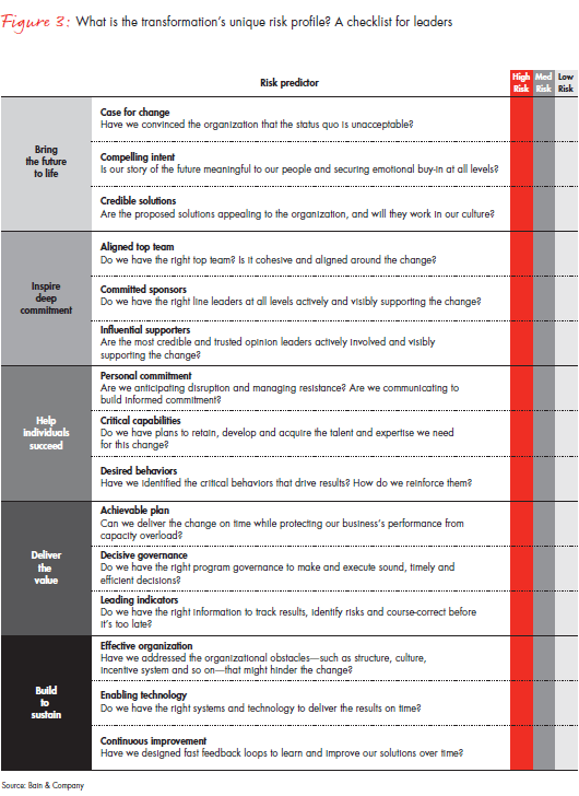 The right choreography also depends heavily on the transformation’s unique risk profile, which reflects the company’s distinct blend of organizational realities. Are the key shareholders, CEO and management team aligned on the need for sweeping change? Is there agreement on what needs fixing? Often, a company’s culture is deeply resistant to change and existing incentives support the status quo. The management bench may be too thin to implement the change effectively, or the organization may be too overburdened to tackle a new set of initiatives. Corporate leaders can assess these organizational risks at each step of the transformation by asking 15 key questions (see Figure 3).