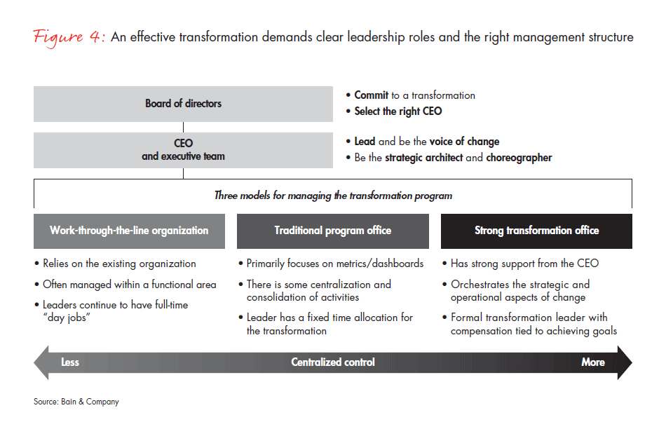 Manny Maceda, who leads Bain's Global Transformation practice, outlines the responsibilities of the major players in building a transformation agenda and achieving transformation goals.