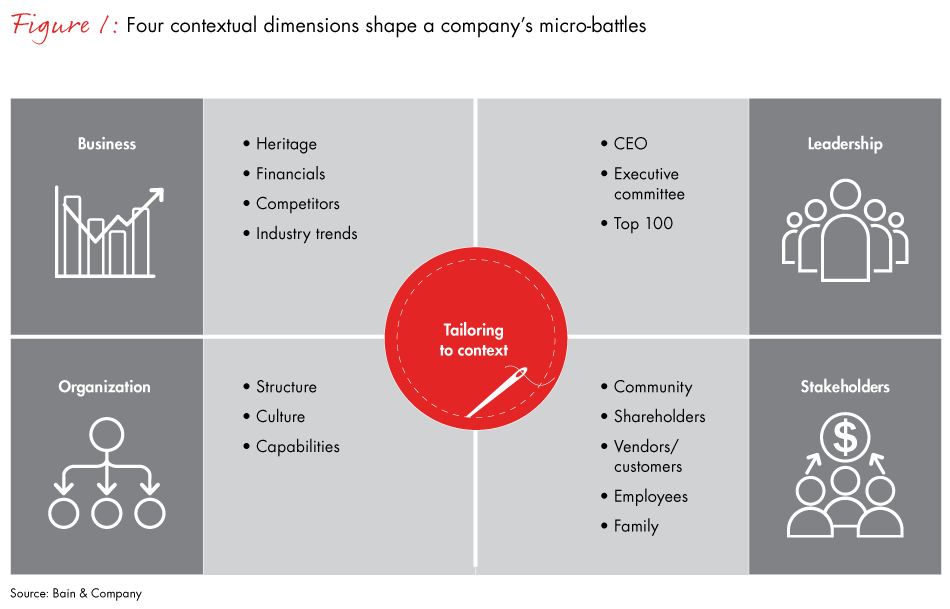 In answering these questions, you will form a full picture of the different dimensions of context that make your company unique. You need to consider these contexts not only when you design the change, but also when you adapt the journey as you learn and scale micro-battles across the organization. Use the contexts to identify and build on your strengths—whether that’s people, heritage, culture or unique customer franchise—and scale that strength throughout the organization with your micro-battles portfolio.