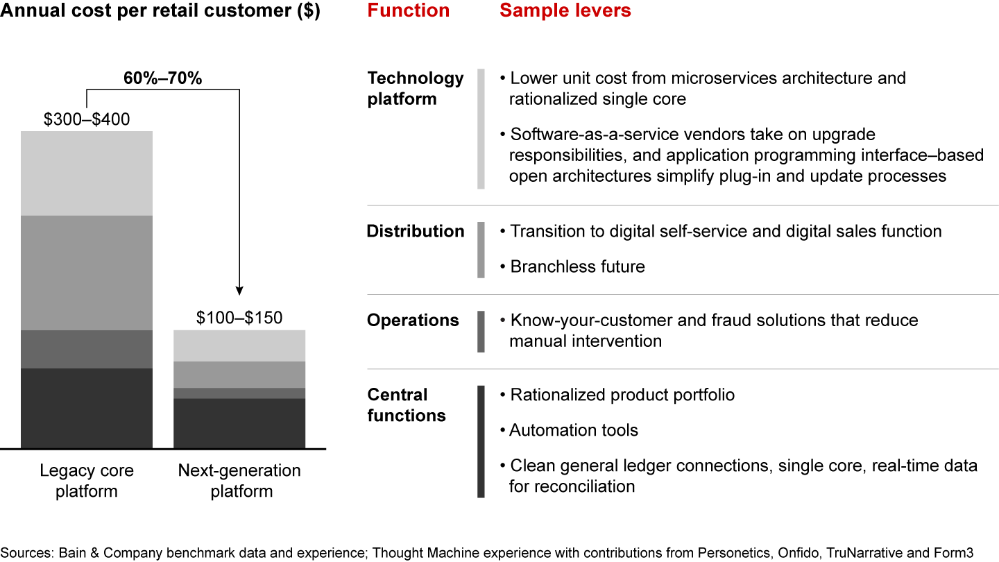 Moreover, lower operating costs flow from having a modern, cloud-native technology platform. Analysis by Bain and Thought Machine finds that a digital attacker launched on such a platform could have a cost base that is 60% to 70% lower than a mid-tier legacy bank (see Figure 2). Bain’s comparison of four attackers with four major incumbents shows that attackers serve two to three times as many customers per employee.