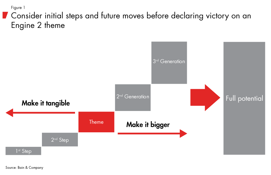2. In developing an Engine 2 strategy, remember that identifying themes is the easy bit. Most Engine 2 strategy exercises start with what we call “theme identification.” The themes are new ideas that cluster around common elements. There are many ways to identify themes. Some companies source them internally through workshops—your people have a lot of great ideas. Others have their leaders participate in brainstorming sessions, where facilitators organize discussions around global macro trends and case examples from other companies. These exercises generate hundreds of Engine 2 ideas, which companies can cluster into five to seven themes. The good news is this is straightforward. The bad news is this is the easy bit. We see two common patterns in theme development.