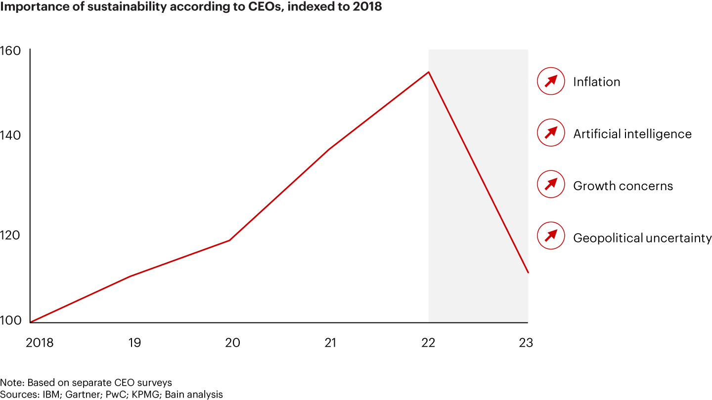 - Inflation, AI, and geopolitics are in the spotlight, but Bain research shows that CEOs and consumers still value sustainability.