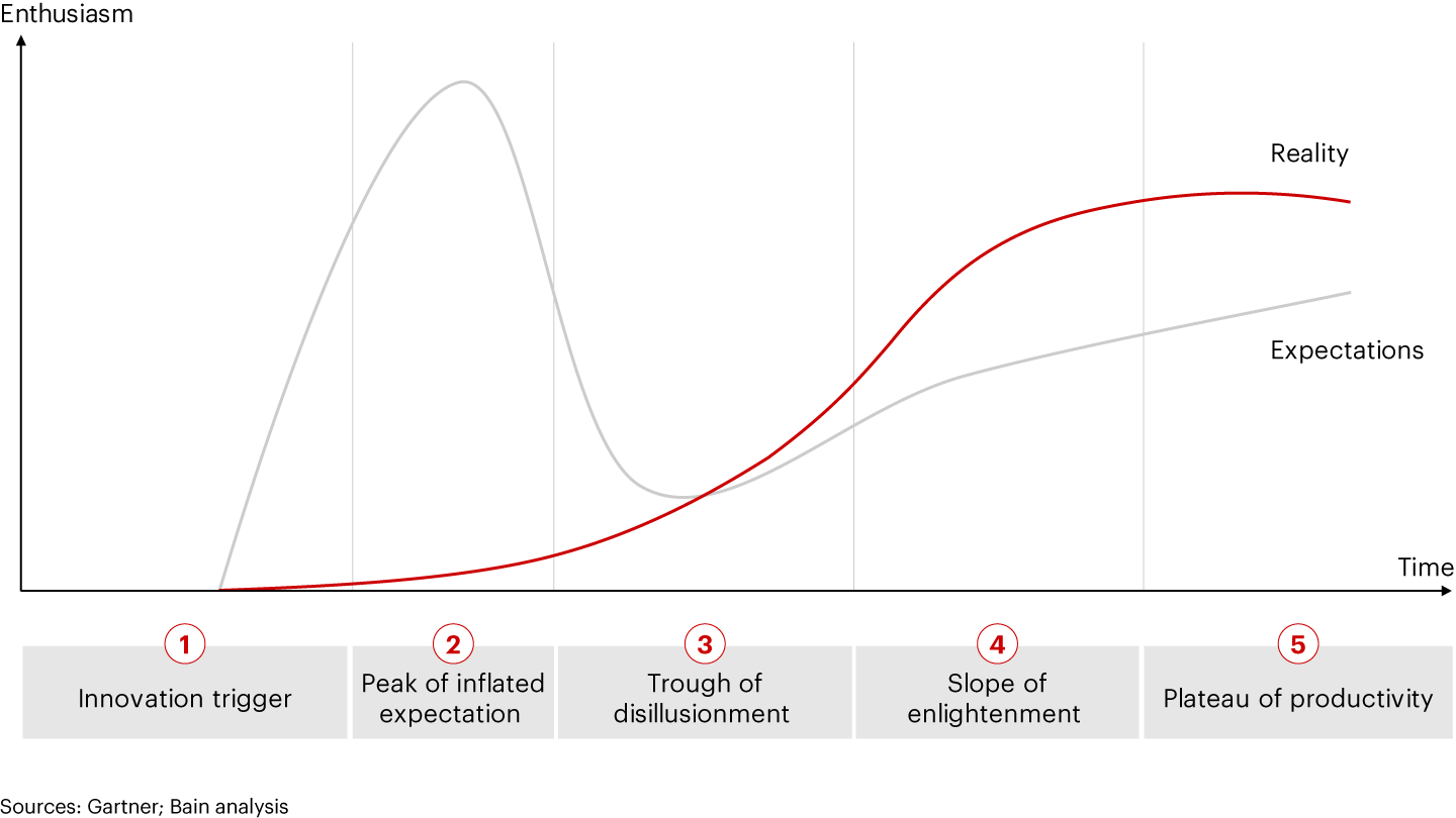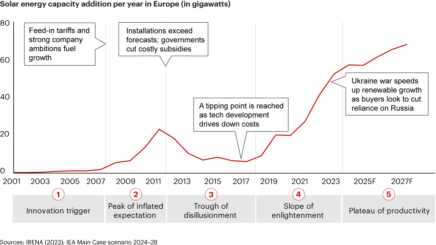 A “hype” phase of excitement, hope, and frenzied activity follows this trigger, with behavior often accelerated by generous policy incentives. When sky-high expectations are not quickly met, or governments pull back prematurely, sentiment falls into the “trough of disillusionment,” a realization that the transformation will not be as quick or as easy as expected. At this point, it’s common for stakeholders to rethink their approach.