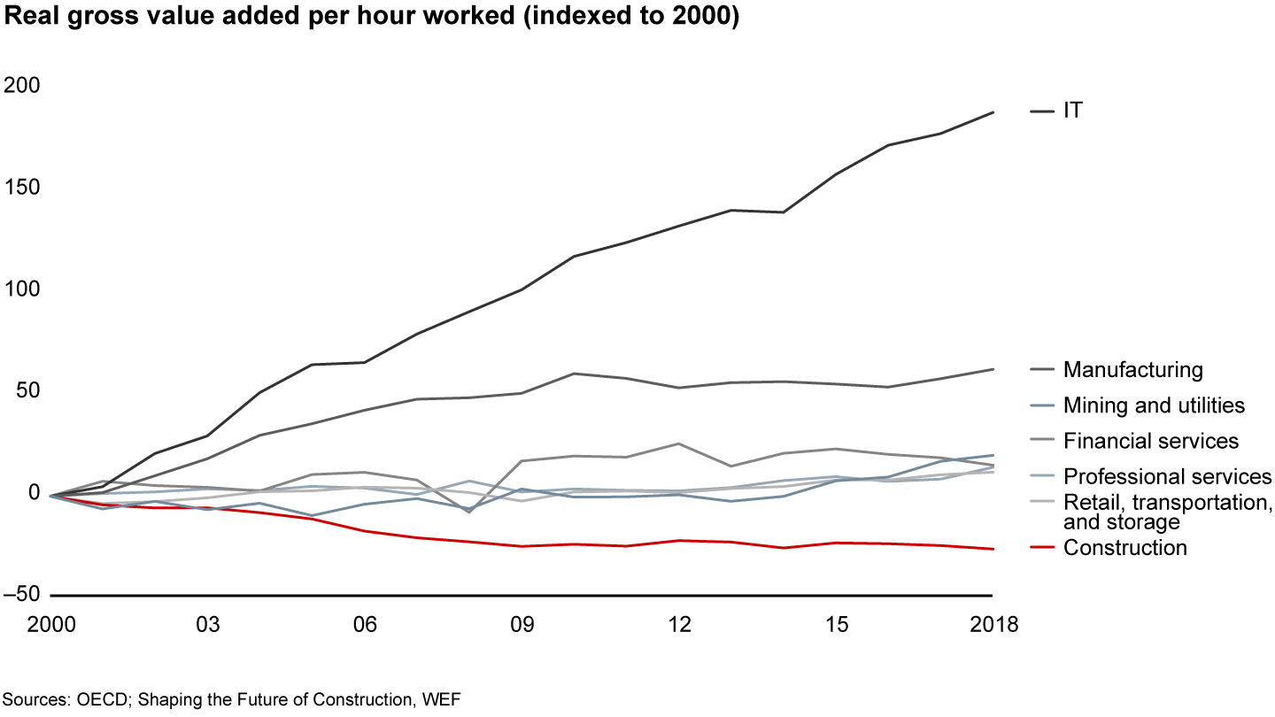 Engineering and procurement both set the stage for the most difficult phase of any project, construction. While other sectors have significantly raised productivity over the past two decades, construction is an outlier (see Figure 3).