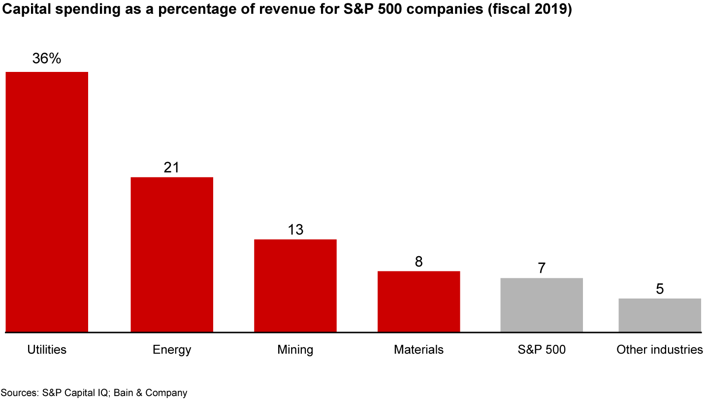 No sector spends more of its revenues on capital expenses than the companies in energy and natural resources (see Figure 1). They’ll have to spend much more as they retrofit old assets and build new ones that meet increasingly strict sustainability requirements, those imposed on them by regulators and the goals they set themselves. Estimated spending on infrastructure to meet the needs of a decarbonizing economy range as high as $50 trillion over the next three decades.