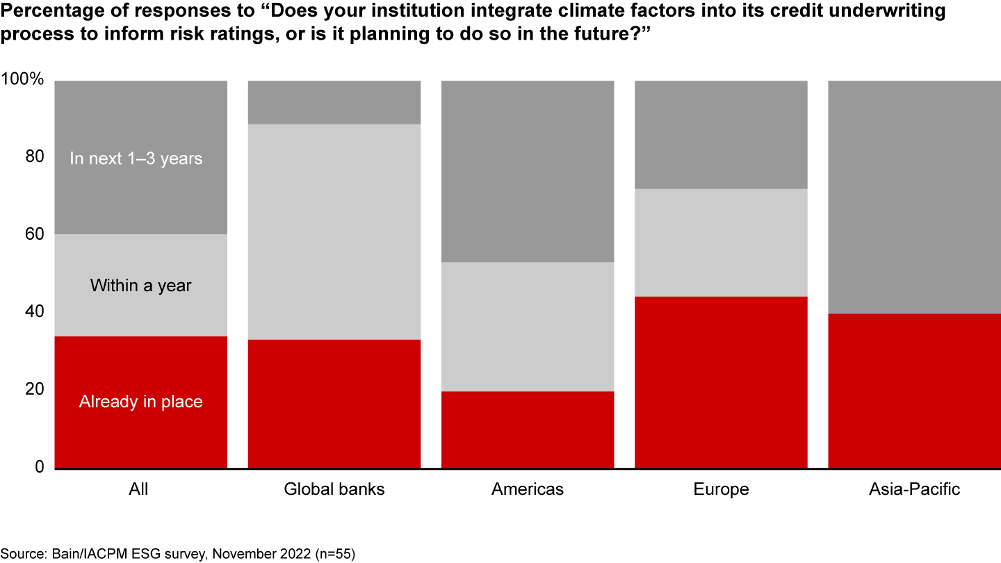 However, while respondents indicate they increasingly look to integrate ESG factors into core processes, it’s still early days. There is a substantial gap between their growth plans and the extent to which they operationalize ESG factors. Some 65% of respondents have yet to incorporate climate data and metrics into credit underwriting processes, with European banks being the furthest along. And while 81% of respondents have identified physical and transition risks, approaches to measurement are still evolving, with half of respondents having quantified their risk exposure.