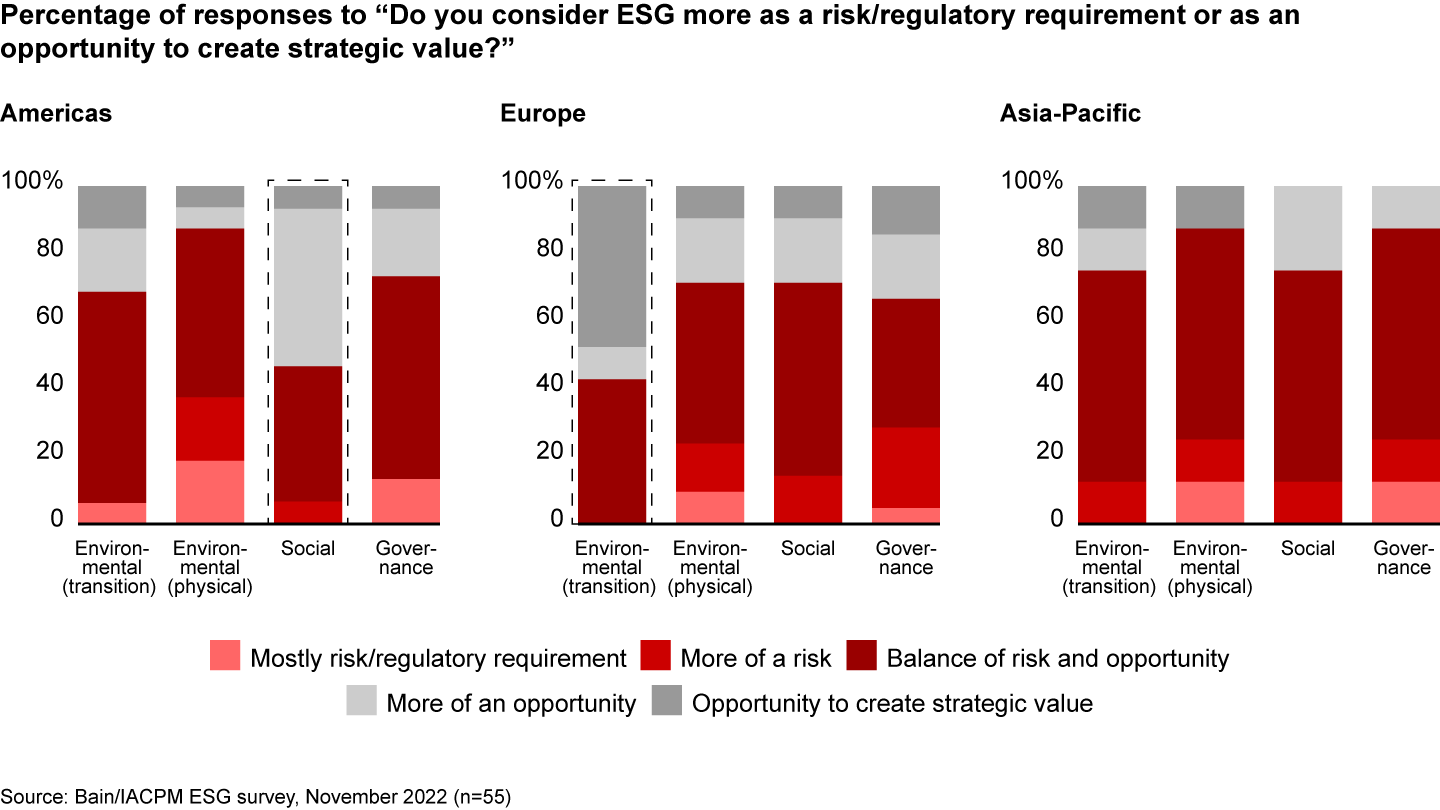 - Views differ on whether ESG pillars primarily represent downside risks to be managed or upside opportunities to be captured, with European respondents most bullish on the opportunities.