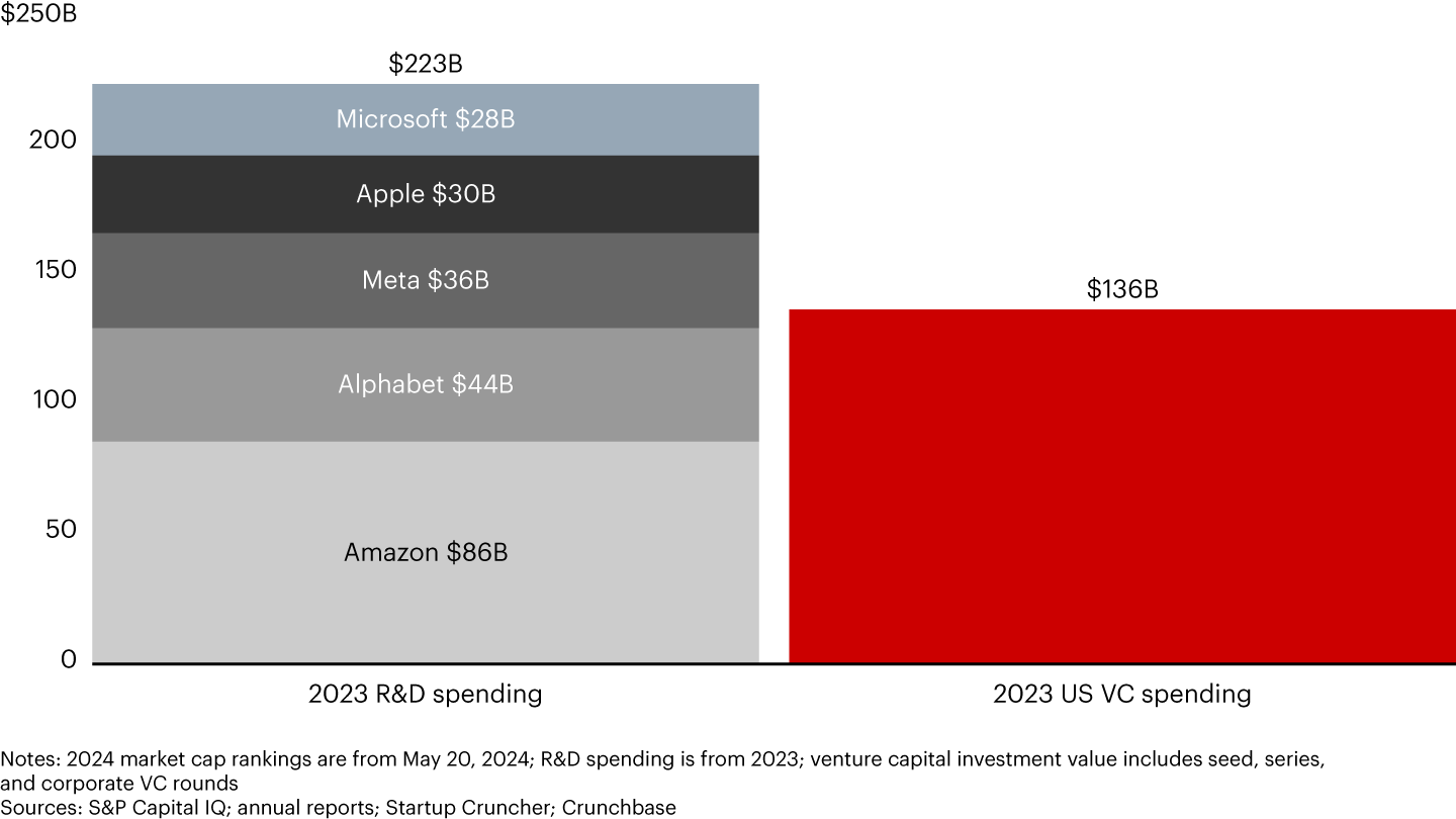 Invest in innovation. Companies strengthen their long-term resilience by continually exploring and evaluating new growth engines. Tech leaders have become extremely profitable and are able to reinvest in innovation. In 2023, the big five hyperscalers (Microsoft, Apple, Alphabet, Meta, and Amazon) spent $223 billion on R&D, about 1.6 times as much as all venture capital spending in the US (see Figure 3). They have corporate venture capital capabilities and are investing in, working with, and sometimes acqui-hiring disruptive start-ups. Apple’s substantial investments in R&D have delivered significant competitive advantage over the years. One example is the Apple silicon project, which led to the development of the M1 and M2 chips that boosted performance and efficiency in its Mac line.