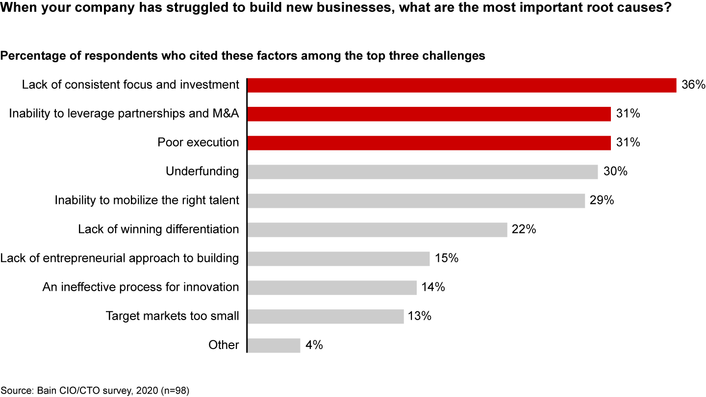 - Access to a key asset or capability of Engine 1 that allows the Engine 2 business to use the scale advantages of the parent to grow. AWS benefited from starting alongside the largest e-commerce platform, where it could scale and innovate rapidly on cutting-edge cloud solutions. The founding teams of YouTube and Instagram created new ways for consumers to engage with content, but their success was fueled by the scale monetization engines of Google and Facebook. Technology companies have stronger business-building capabilities than many industries, but their biggest Engine 2 challenges include inconsistent and insufficient investment and a failure to use M&A and partnerships to accelerate their bet (see Figure 2).