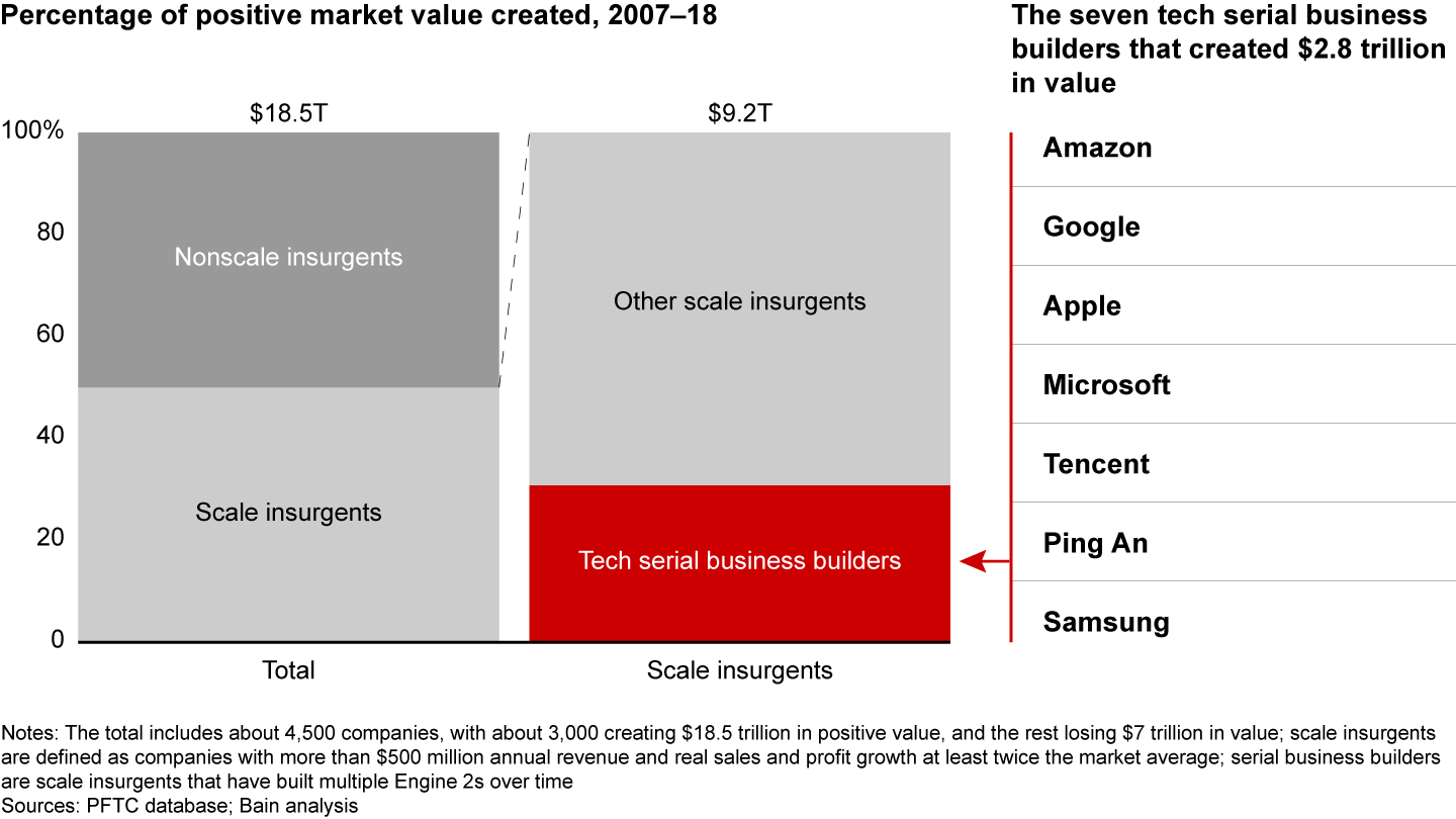 Seven technology serial business builders—Amazon, Google, Apple, Microsoft, Tencent, Ping An, and Samsung—were responsible for 15% of all the positive market value created from 2007 to 2018 (see Figure 1).