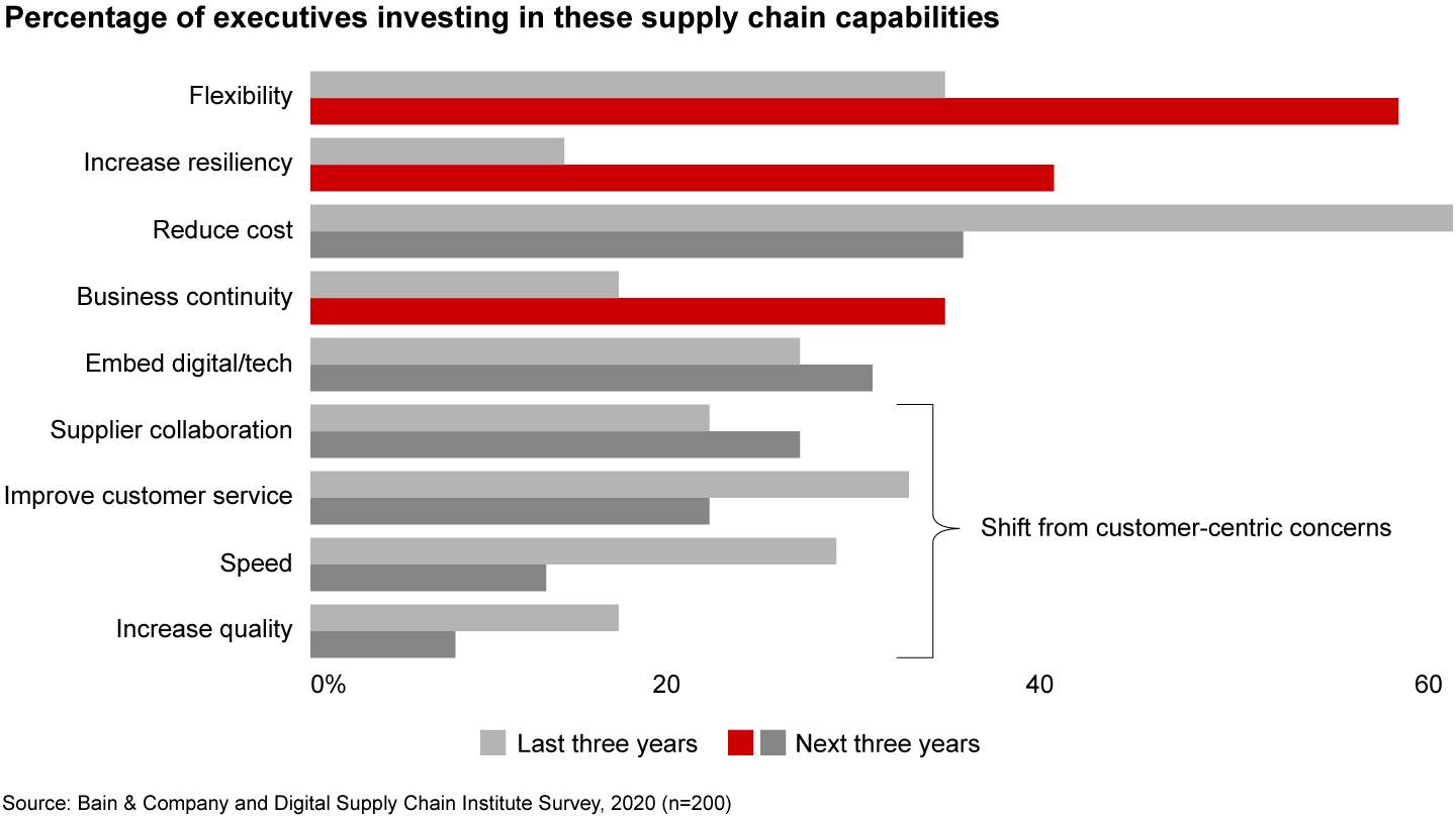 - Supply chain executives are shifting investment priorities to reduce disruption and improve sustainability.