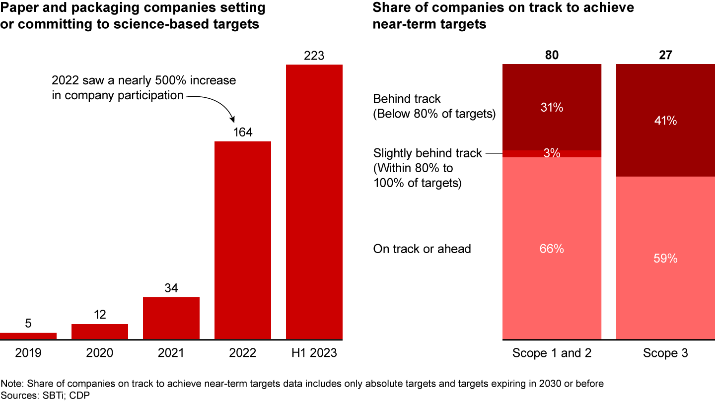 Paper and packaging companies have started to address sustainability, but most can do much more. While the number of companies in the industry that have verified or committed to science-based targets has rapidly increased from 5 companies in 2019 to 164 in 2022, more than 30% of those companies have missed their near-term Scope 1 and Scope 2 targets—and even more are missing their Scope 3 targets (see Figure 1).
