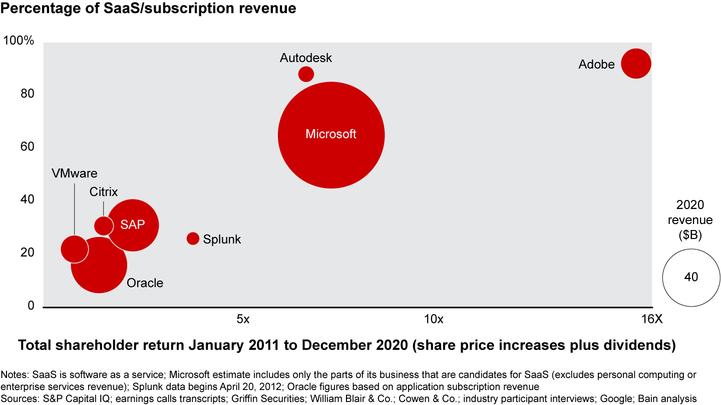 Software companies that increase their share of revenue from subscription models have stronger growth in share price