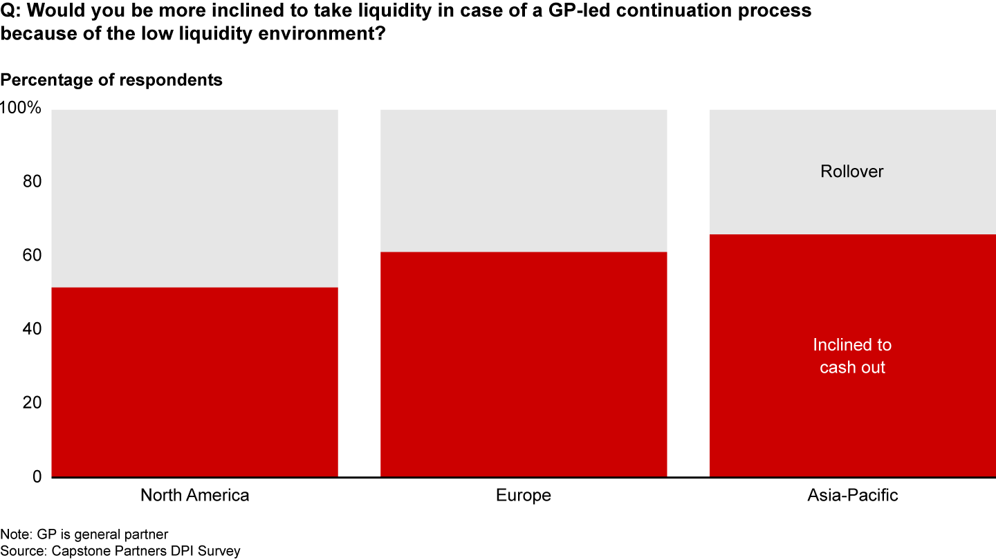 Buyout funds alone are sitting on a record $2.8 trillion in unexited assets—over four times the level held during the global financial crisis. That has precipitated a liquidity crunch for limited partners (LPs) that has contributed to the industry’s abrupt skid in fund-raising over the past 12 months. For cash-strapped LPs, DPI (distributed to paid-in capital) is becoming the new IRR (internal rate of return). When asked in a recent survey if liquidity concerns left them more inclined to cash out of a hypothetical investment or roll it over into a GP-led secondary, around 60% of LPs said they’d take the cash (see Figure 1). The message to fund managers: LPs would prefer you to generate liquidity than try to squeeze another half-turn of multiple from every last portfolio company.