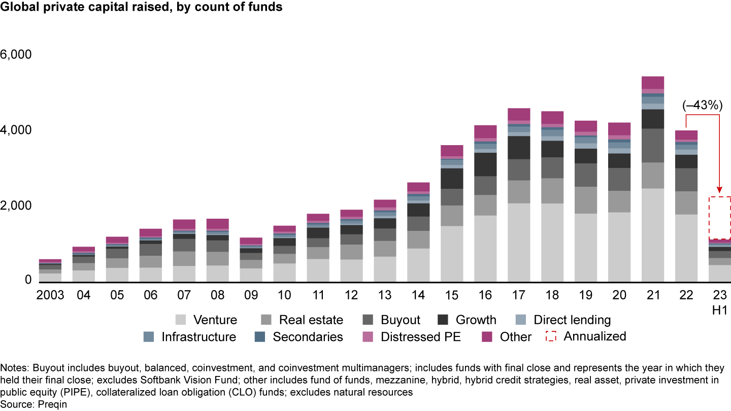 - First-half 2023 results picked up where 2022 left off as continued macro uncertainty kept a lid on investments, exits, and fund-raising.