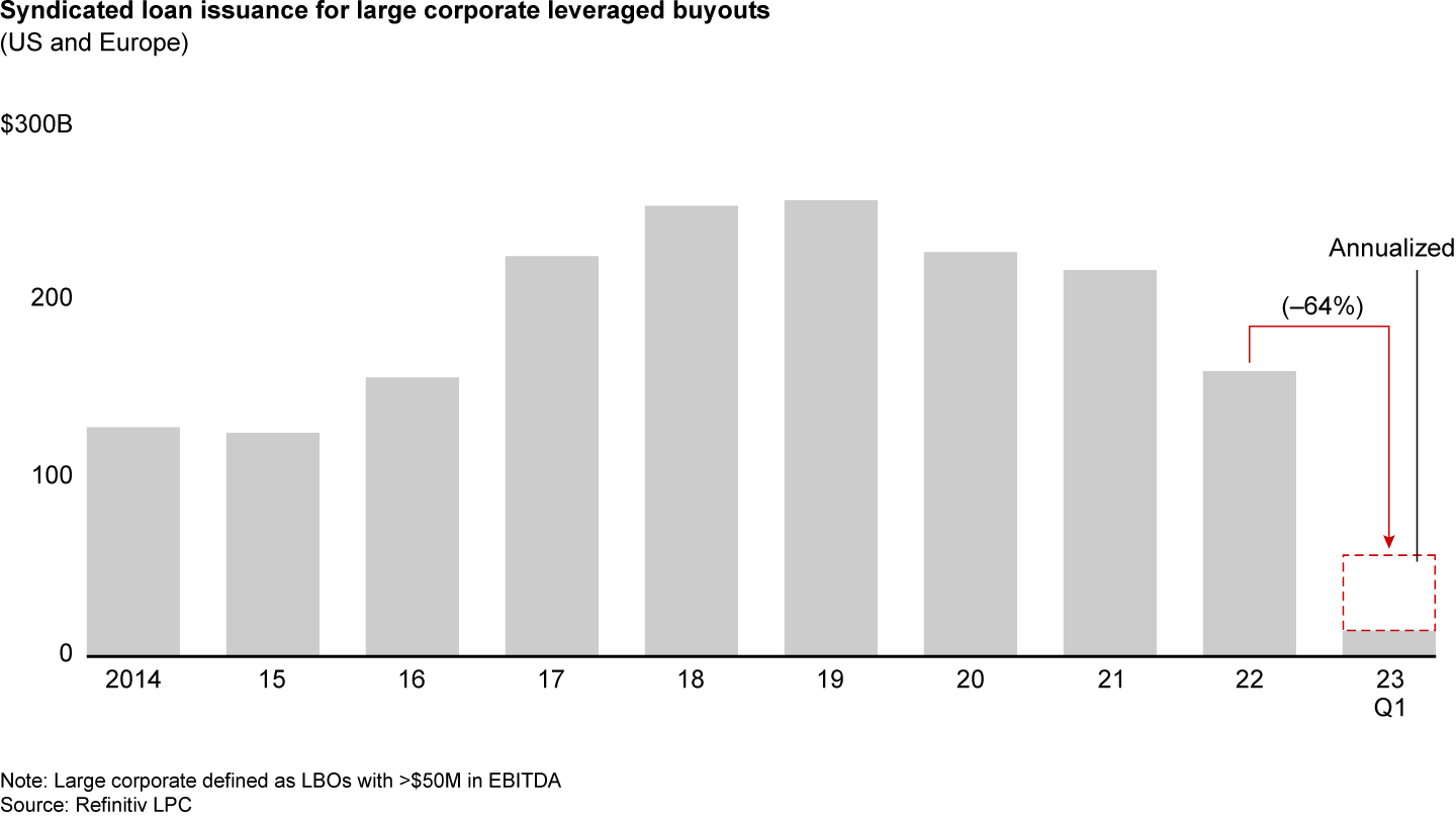 Dealmaking has suffered from jitters on the part of buyers and sellers struggling to make sense of an array of macro challenges. It also been harder to get a loan. Rising rates have pushed the price of any form of credit higher, and economic uncertainty has given bankers vertigo. On an annualized basis, syndicated loan issuance to large leveraged buyouts is down 64% from a year ago (see Figure 3). What’s kept the middle market alive is the continued growth of private credit. Direct lending has become a major factor in funding middle-market leveraged buyouts and is extending into larger and larger deals, usually as part of a consortium of lenders.