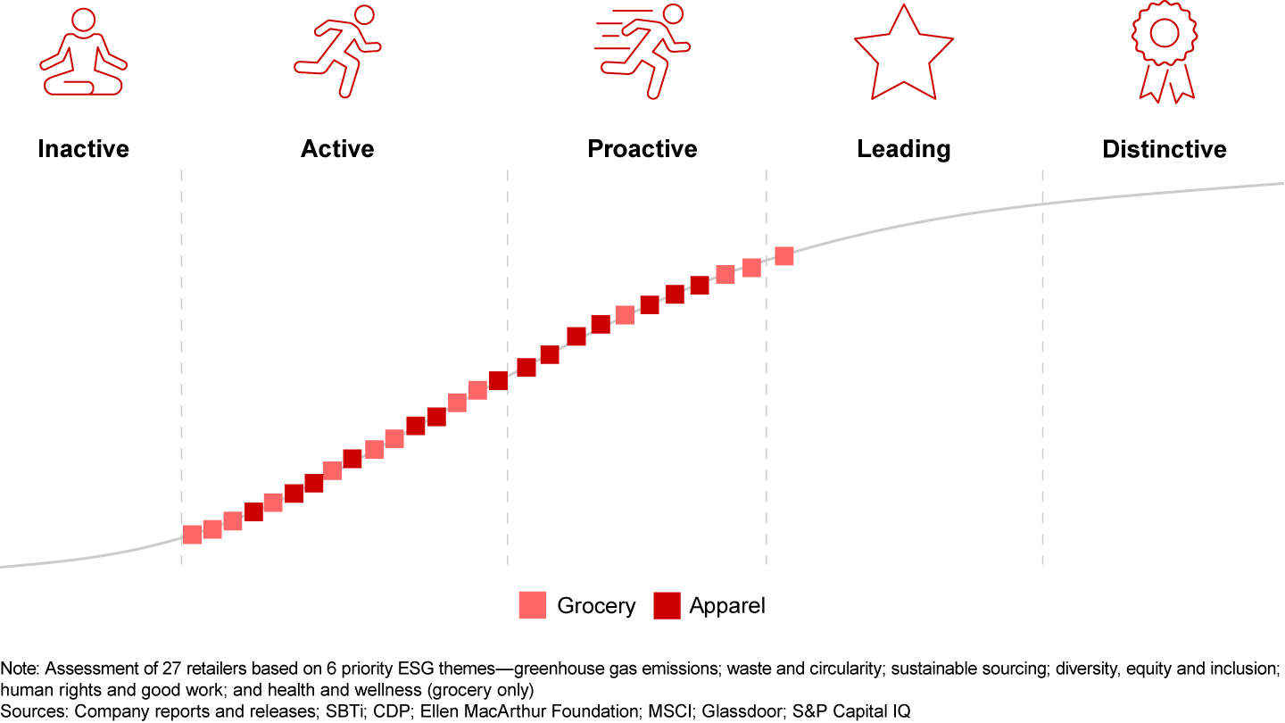 However, the industry knows it’s still a long way from where it needs to be. A recent Bain & Company survey showed that 9 out of 10 retailers have made less, or far less, sustainability progress than they expected. In our latest ESG maturity analysis across the US, Asia-Pacific, and Europe, only 1 of the 27 grocers and apparel retailers assessed had a leading approach to ESG, with none emerging as truly distinctive (see Figure 1).