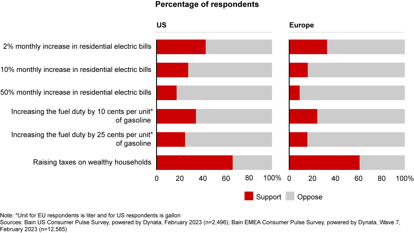 The trouble is that although consumers are concerned about climate change, data suggests that they may not be willing to pay higher bills to help combat it. Recent Bain surveys found that less than half of US and EU consumers are willing to pay even a small increase in their residential electric bill or fuel price to reduce emissions. Instead, they prefer raising taxes on wealthy households, suggesting that consumers believe government should intervene to bring down prices of new technologies (see Figure 3).