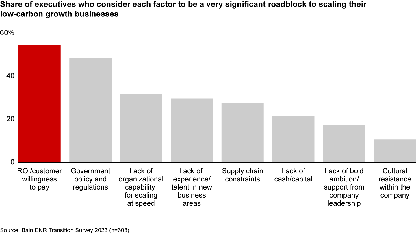 Executives say the greatest obstacles to scaling low-carbon businesses are customers’ unwillingness to pay higher prices and the difficulty of ensuring adequate returns on investment