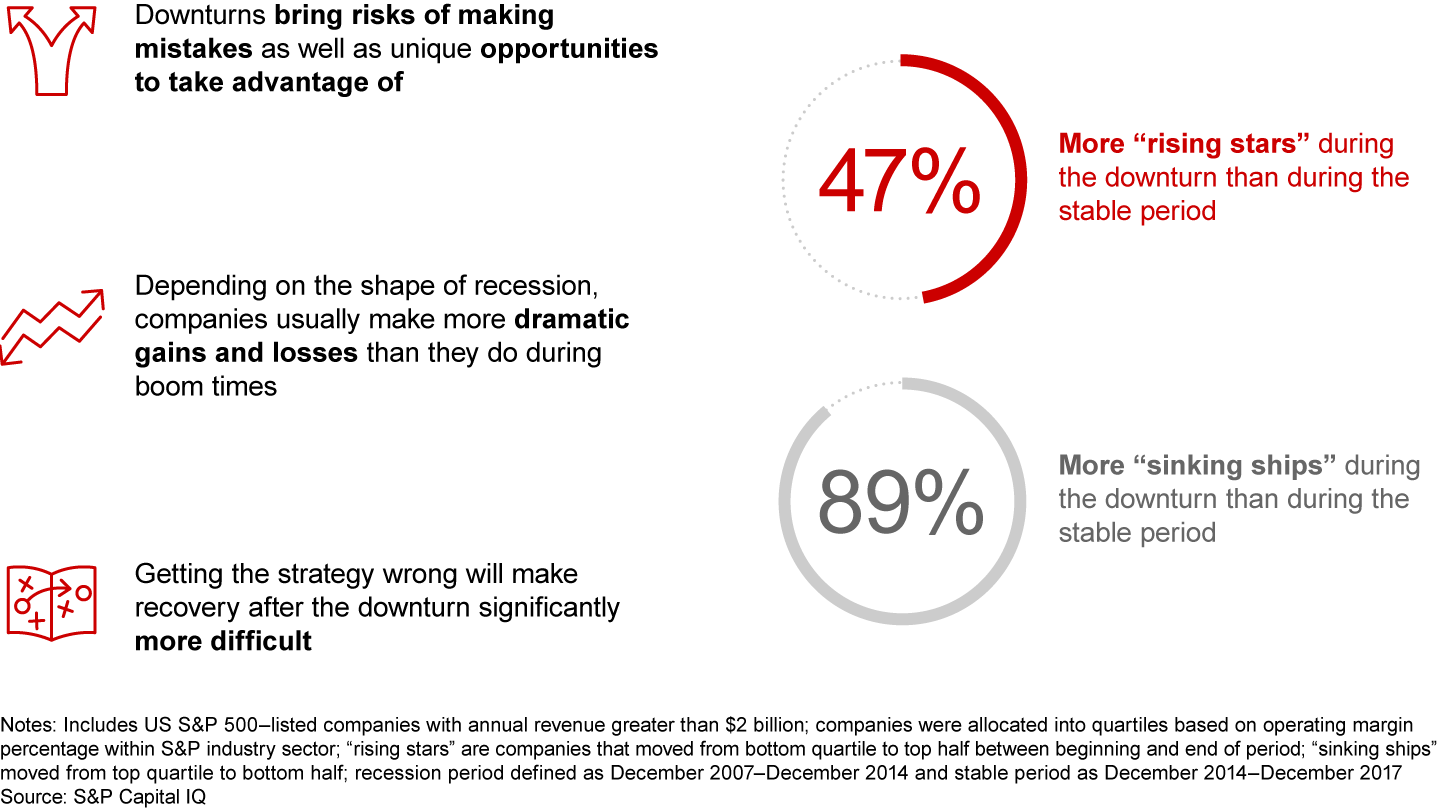 • Our research has found that companies make more dramatic gains or losses during downturns than during stable periods.