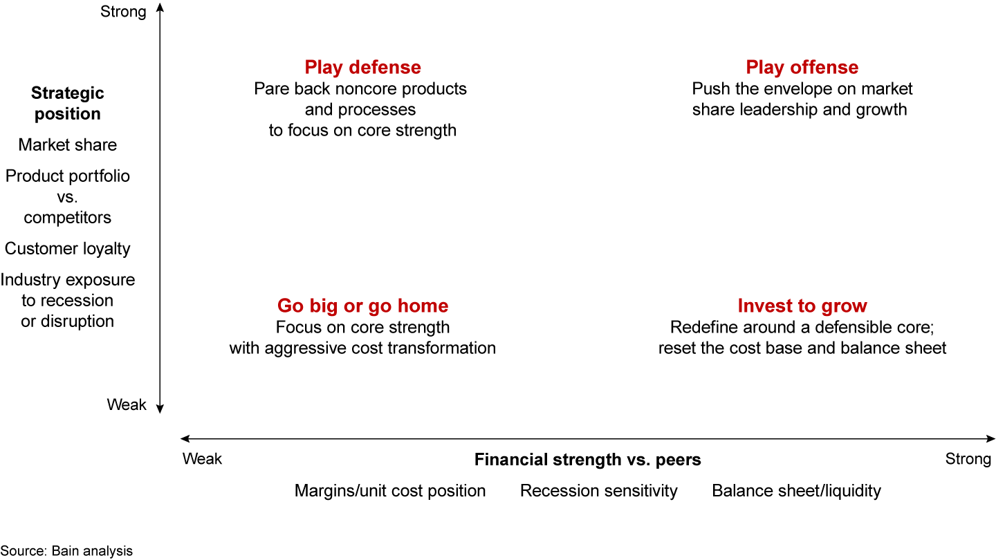 The best companies begin with a realistic assessment of the company’s starting position—namely, how it compares with its competitors in strategic position and financial strength (see Figure 3). That guides the sequencing and emphasis of recessionary levers. It helps dictate whether the company is better suited to play defense by paring back noncore products and focusing on core strengths, for example, or to play offense by pushing the envelope on market share leadership and growth. In the pre-recession context, companies should develop recession signposts and triggers to monitor emerging scenarios, drawing up ready-to-follow steps when those triggers occur.