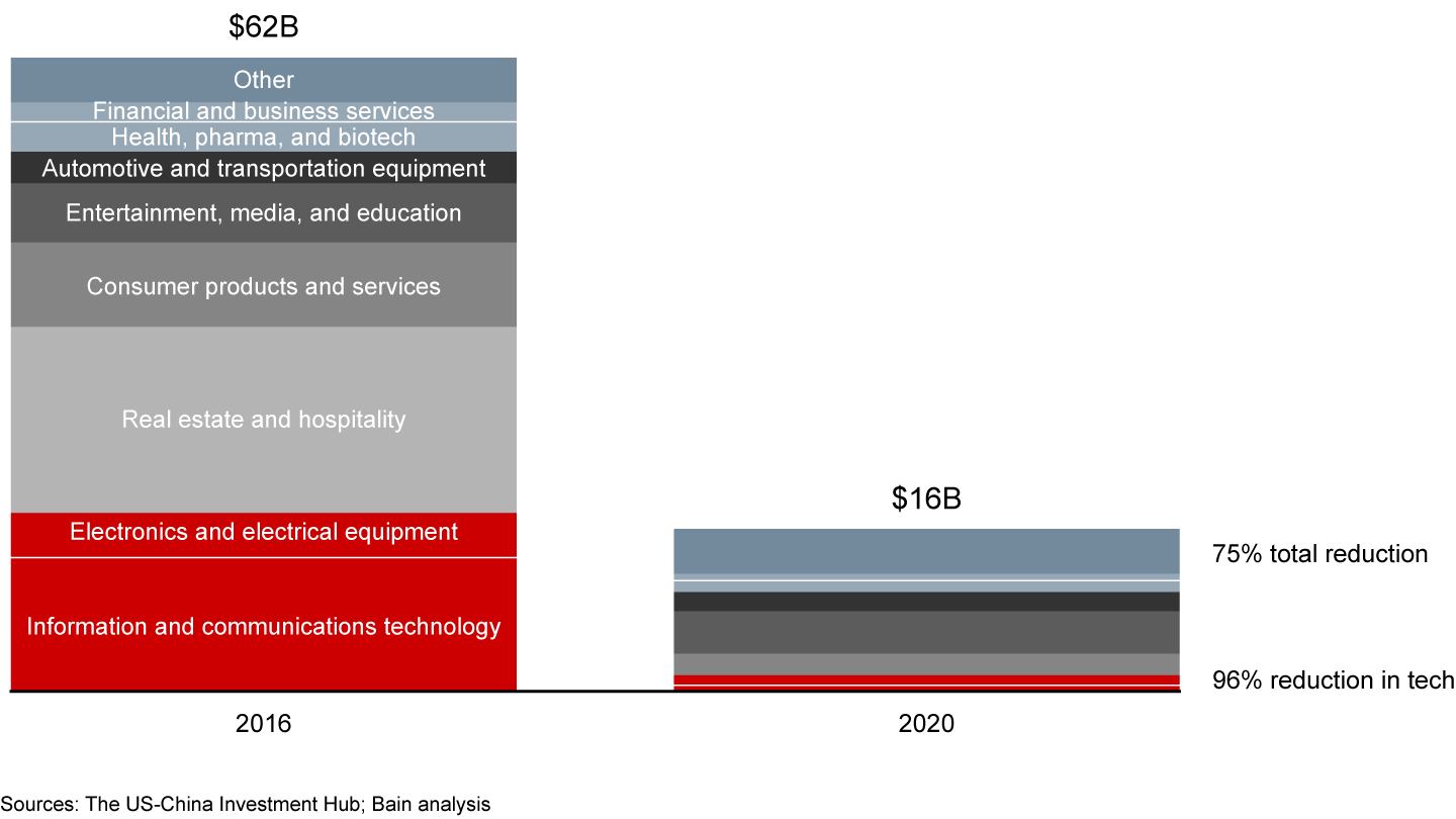 Foreign direct investment between the US and China has declined significantly, especially in technology
