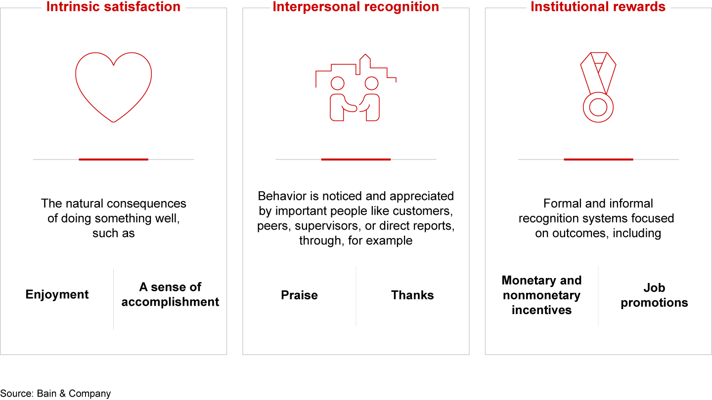 Interpersonal recognition works because it’s rooted in the human need to connect with the important people in our life. Sincere appreciation from a peer, customer, manager, or direct report is valuable, and one way to make sure people hear it is to embed rapid feedback loops into daily routines, the way the Net Promoter System℠, for example, connects employees with customer feedback.
