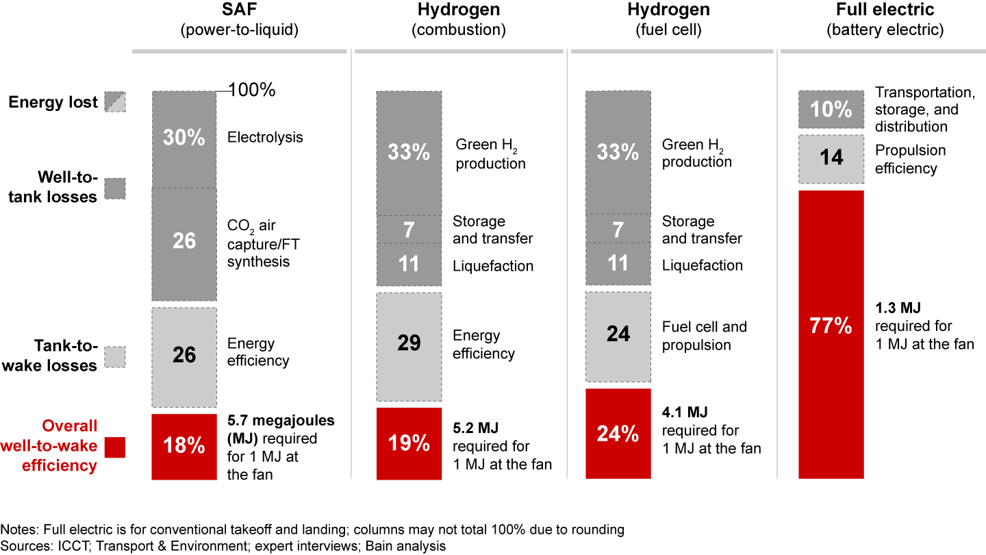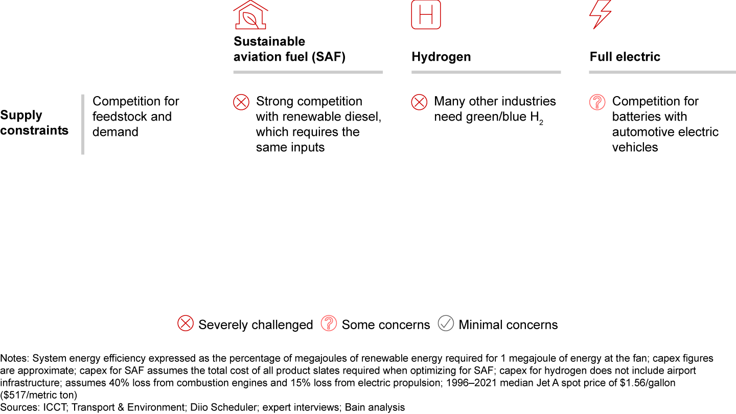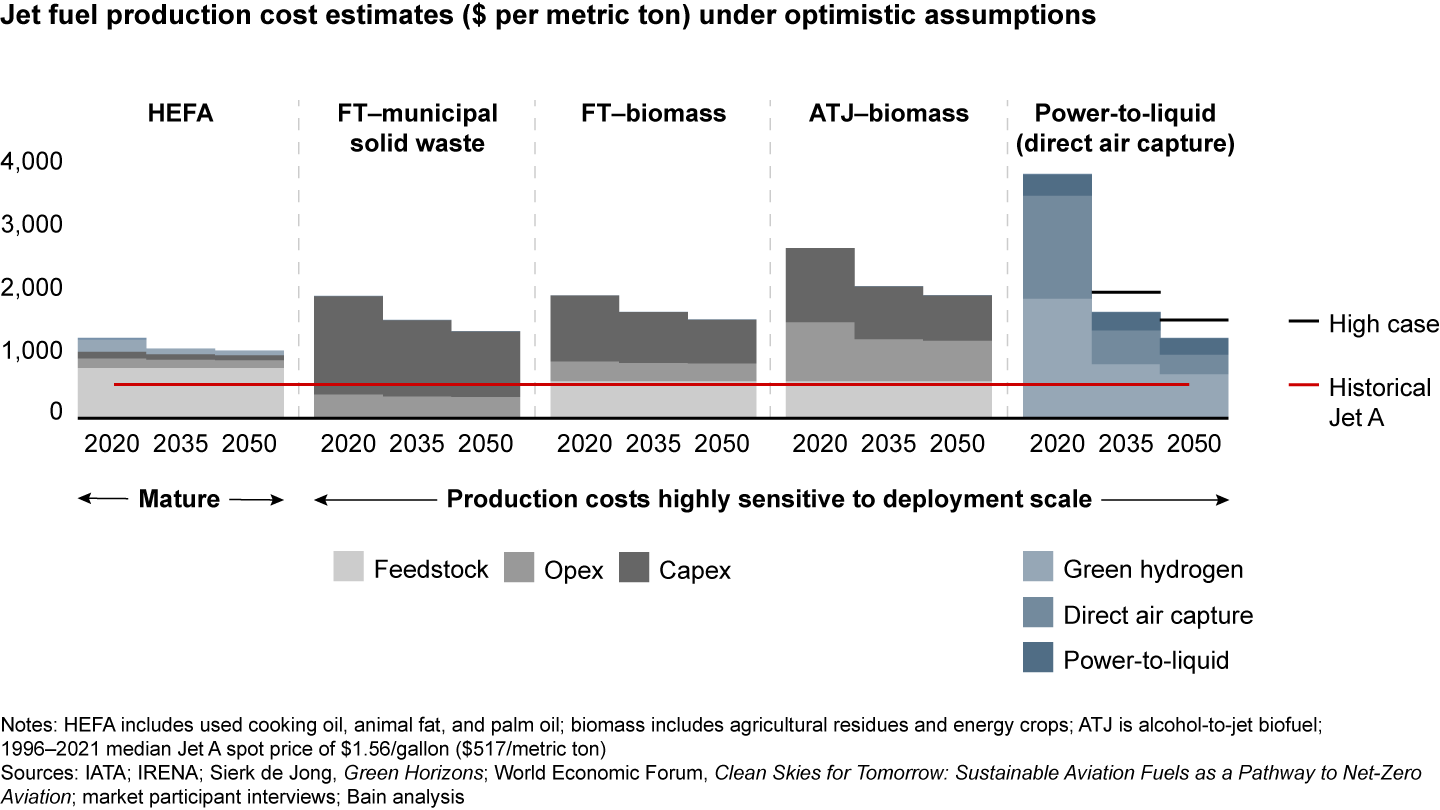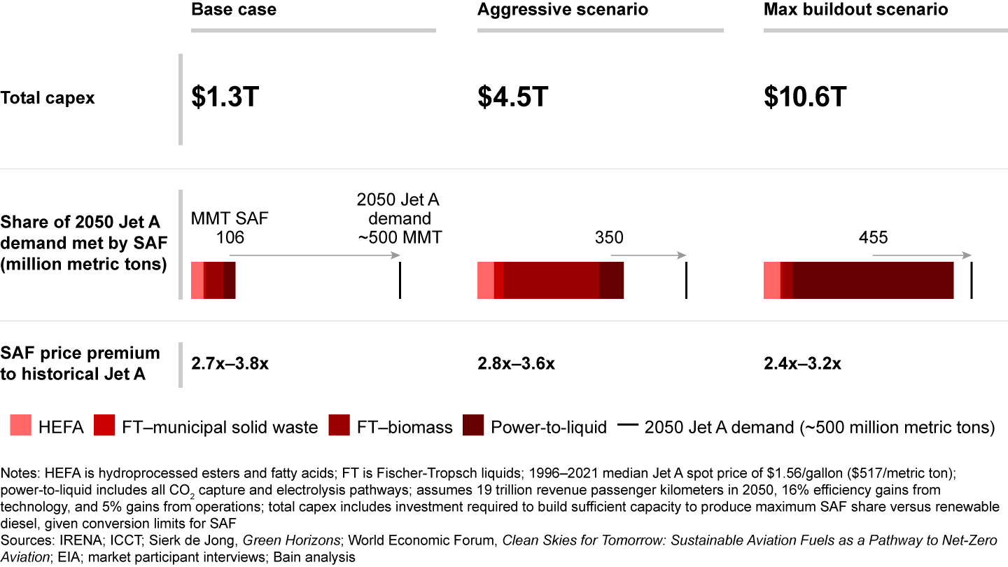 - Bain research shows that a cumulative investment of $1.3 trillion in sustainable fuel production would satisfy only about 20% of forecast 2050 aviation fuel demand.