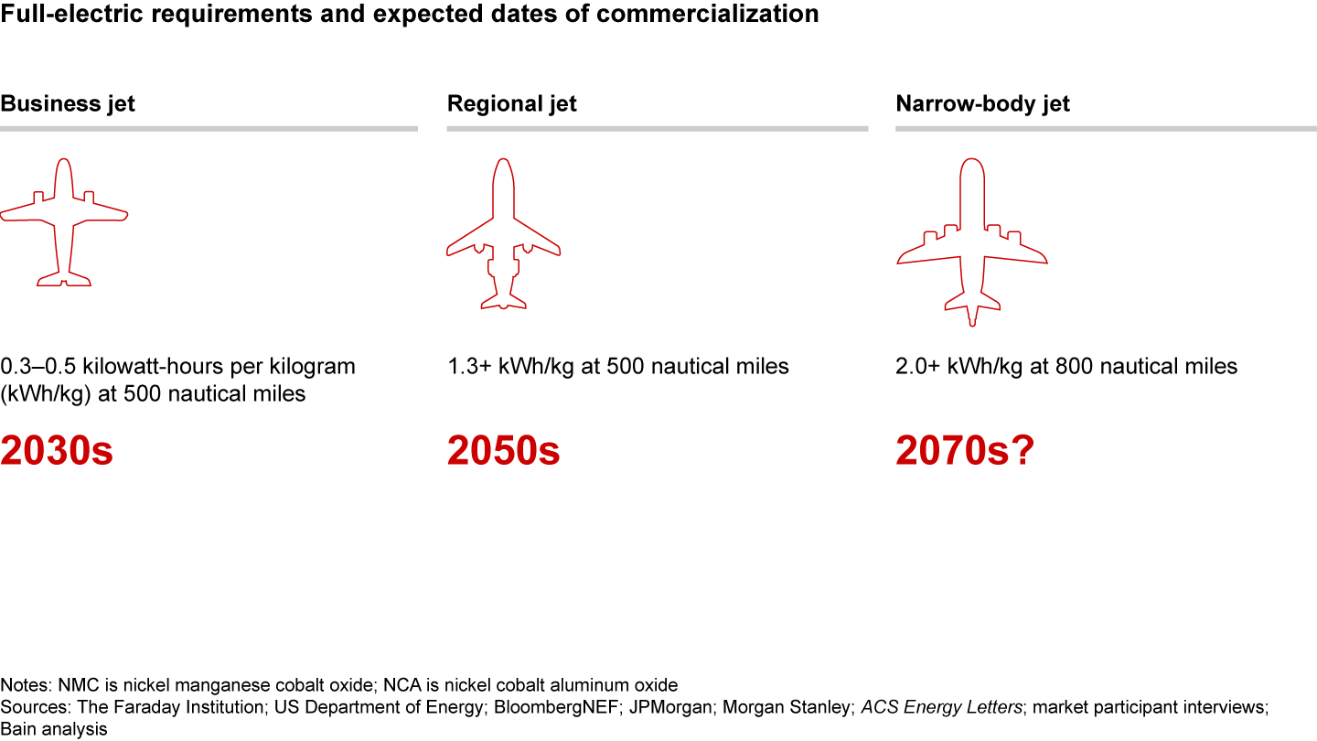 - Battery densities are unlikely to evolve fast enough through 2050 to power most air travel covered today by narrow-body or wide-body jets (see Figure 5).