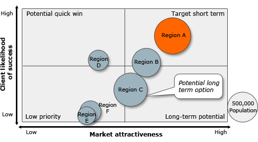 Bain evaluated initial focus areas based on market attractiveness and client likelihood of success: