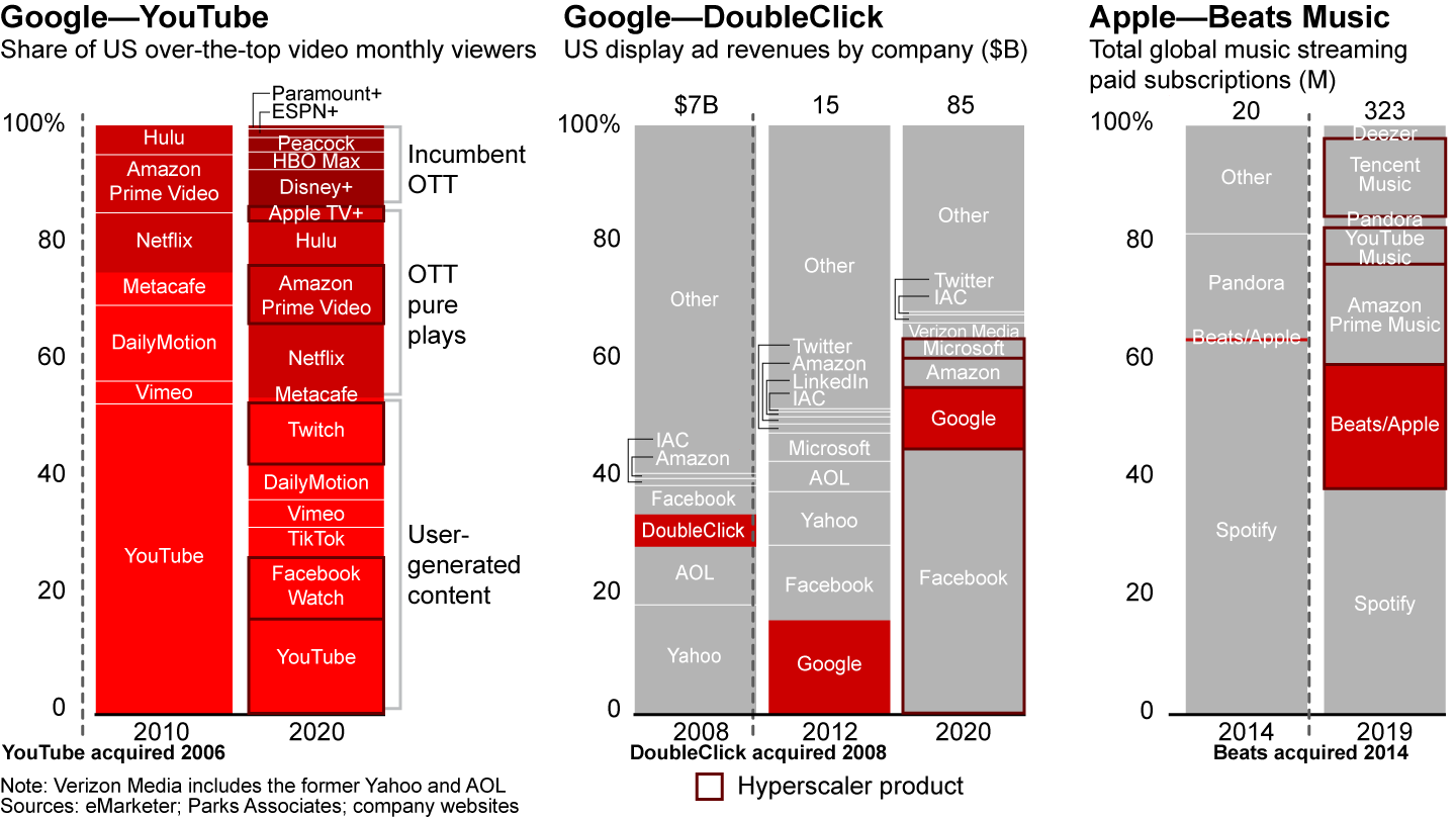 Acquisitions have also fueled competition among the hyperscalers (see Figure 6). Facebook, Amazon, and Apple now challenge Google’s YouTube for video views. Apple Music, buoyed by its Beats acquisition, competes with YouTube Music and Amazon Prime Music for paid subscribers. Display ads are a fierce battleground among Facebook, Google, Amazon, and Microsoft, even after Google’s DoubleClick acquisition.