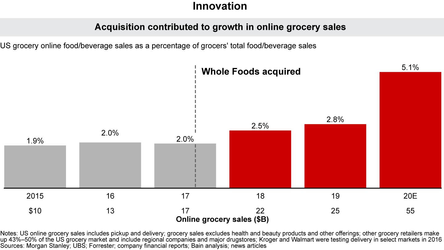 Amazon has also increased access to innovation through its dealmaking. The Whole Foods acquisition contributed to the growth of US grocers’ online food and beverage sales, which increased from 2% to 2.5% of US grocers’ total food and beverage sales the year after the deal. And Amazon’s acquisition of warehouse robotics company Kiva Systems reduced fulfillment times from an hour-plus to 15 minutes, shortening the time from click to delivery for consumers.