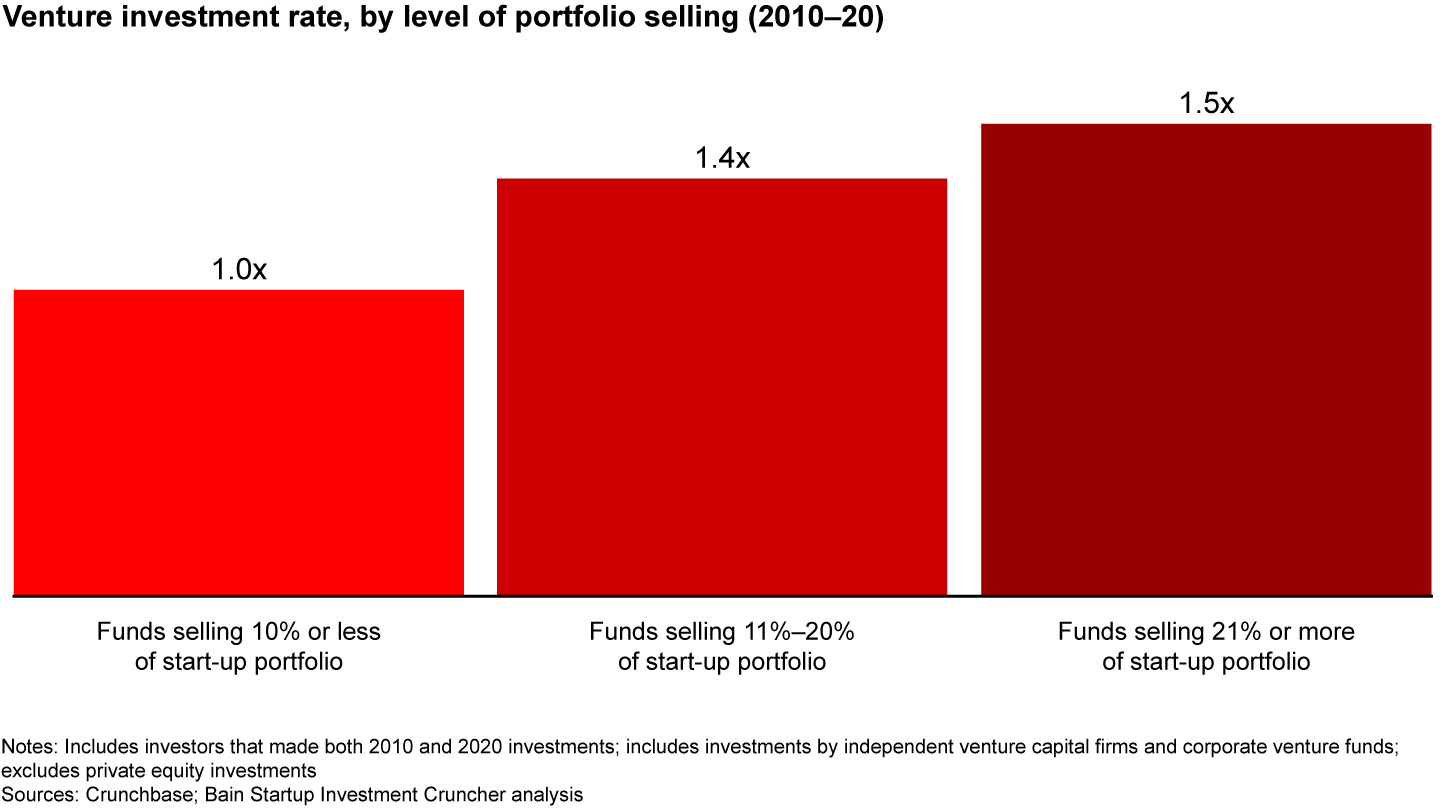 Acquisitions power a virtuous cycle in start-up investments by providing viable exits that allow investors to pour money into the next wave of deals. Over the past decade, independent venture capital firms and corporate venture funds that sold 11% to 20% of their start-up portfolio invested in 40% more deals than funds that sold 10% or less of their portfolio (see Figure 7). The gap is even wider for firms that sold 21% or more of their portfolio.