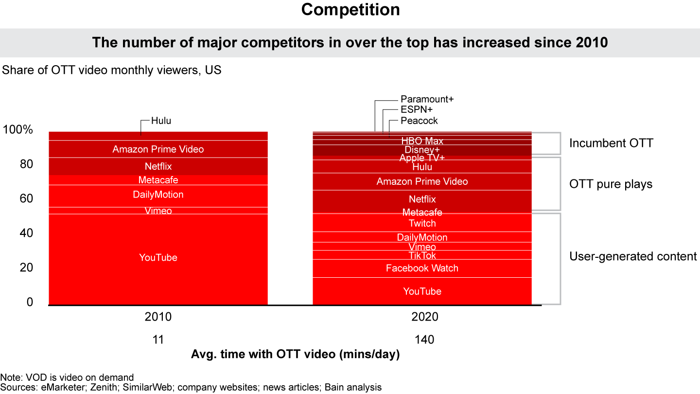 In video streaming, YouTube helped fuel the proliferation of “over the top” (OTT) video providers such as Hulu, Sling, and Disney+. Now, YouTube competes for advertising dollars both with other OTT providers and traditional television companies.