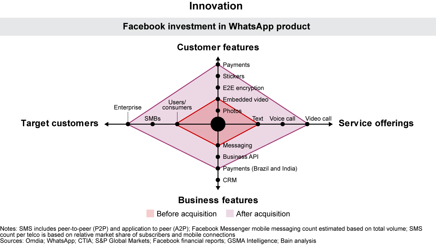 A third benefit is that tech acquirers frequently accelerate purchased companies’ pace of innovation by providing resources and the breathing room to keep experimenting. Facebook’s WhatsApp acquisition freed the messaging service to focus on the consumer experience and relieved the pressure to become profitable before it was ready. Under the wing of its parent company, WhatsApp rapidly expanded the app and launched features such as end-to-end encryption, payments, and B2B services (see Figure 4).